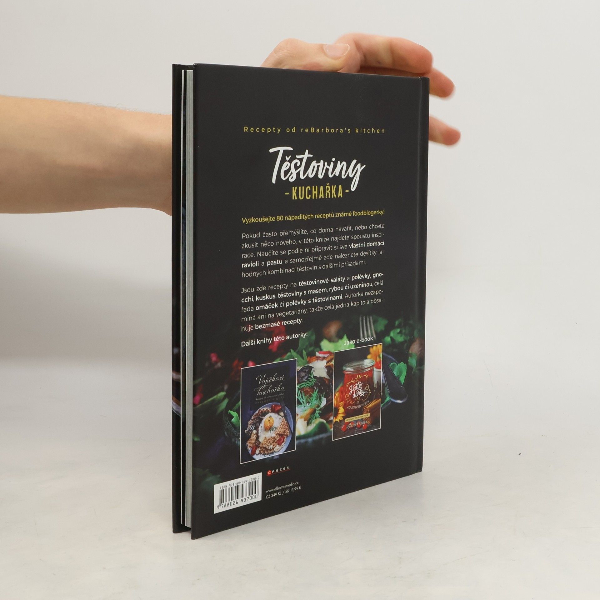 Recepty od reBarbora‘s kitchen. Vyzkoušejte 80 nápaditých receptů známé foodblogerky! Pokud často přemýšlíte, co doma navařit, nebo chcete zkusit něco nového, v této knize najdete spoustu inspirace. Naučíte se podle ní připravit si své domácí ravioli a pastu, a samozřejmě zde naleznete desítky lahodných kombinací těstovin s dalšími přísadami. Jsou zde recepty na těstovinové saláty a polévky, gnocchi, kuskus, těstoviny s masem, rybou či uzeninou, celá řada omáček, polévky s těstovinami. Autorka nezapomíná ani na vegetariány, takže celá jedna kapitola obsahuje bezmasé recepty.