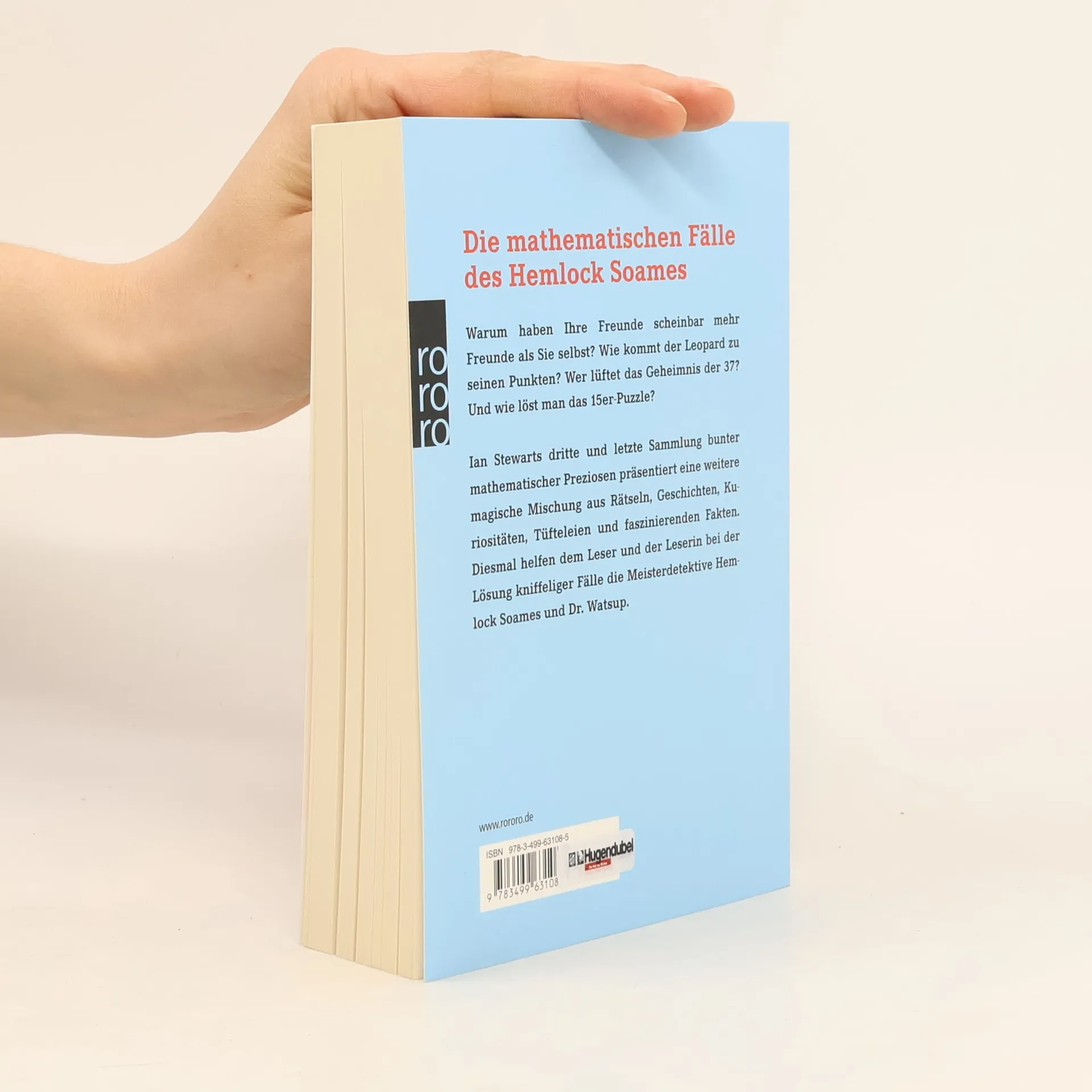 Warum haben Ihre Freunde scheinbar mehr Freunde als Sie selbst? Wie kommt der Leopard zu seinen Punkten? Wer lüftet das Geheimnis der 37? Warum sind Hexakosioihexekontahexaphobiker schlicht im Irrtum? Und wie löst man das 15er-Puzzle? Hier kommt Ian Stewarts dritte und letzte Sammlung bunter mathematischer Preziosen: Fakten, Anekdoten, Spiele, Knobeleien, Kuriosa, Grundlagenwissen und überraschende Neuigkeiten. Schmankerl für Krimiliebhaber: Conan-Doyle-Fan Stewart streut in seine rund 150 Kabinettstückchen immer wieder mathematische Detektivgeschichten ein, deren Helden ein gewisser Hemlock Soames und sein Sidekick Dr. Whatsup sind, wohnhaft in der Bakerstreet 222B. In den dramatischen Schlusskapiteln kommt es in der Schweiz zu einer letzten, tödlichen Konfrontation mit Soames’ Erzfeind, dem teuflischen Professor Mogiarty… Die beiden ersten Bände, «Professor Stewarts Mathematisches Sammelsurium» sowie «Professor Stewarts Mathematische Schätze» haben Ian Stewart auch in Deutschland zum Lieblingsautor vieler Mathematik-Fans werden lassen. Dieser abschließende Band der Sammelsurium-Trilogien bietet wieder kurzweiliges mathematisches Infotainment, das kaum ein Autor so gut beherrscht wie Ian Stewart.