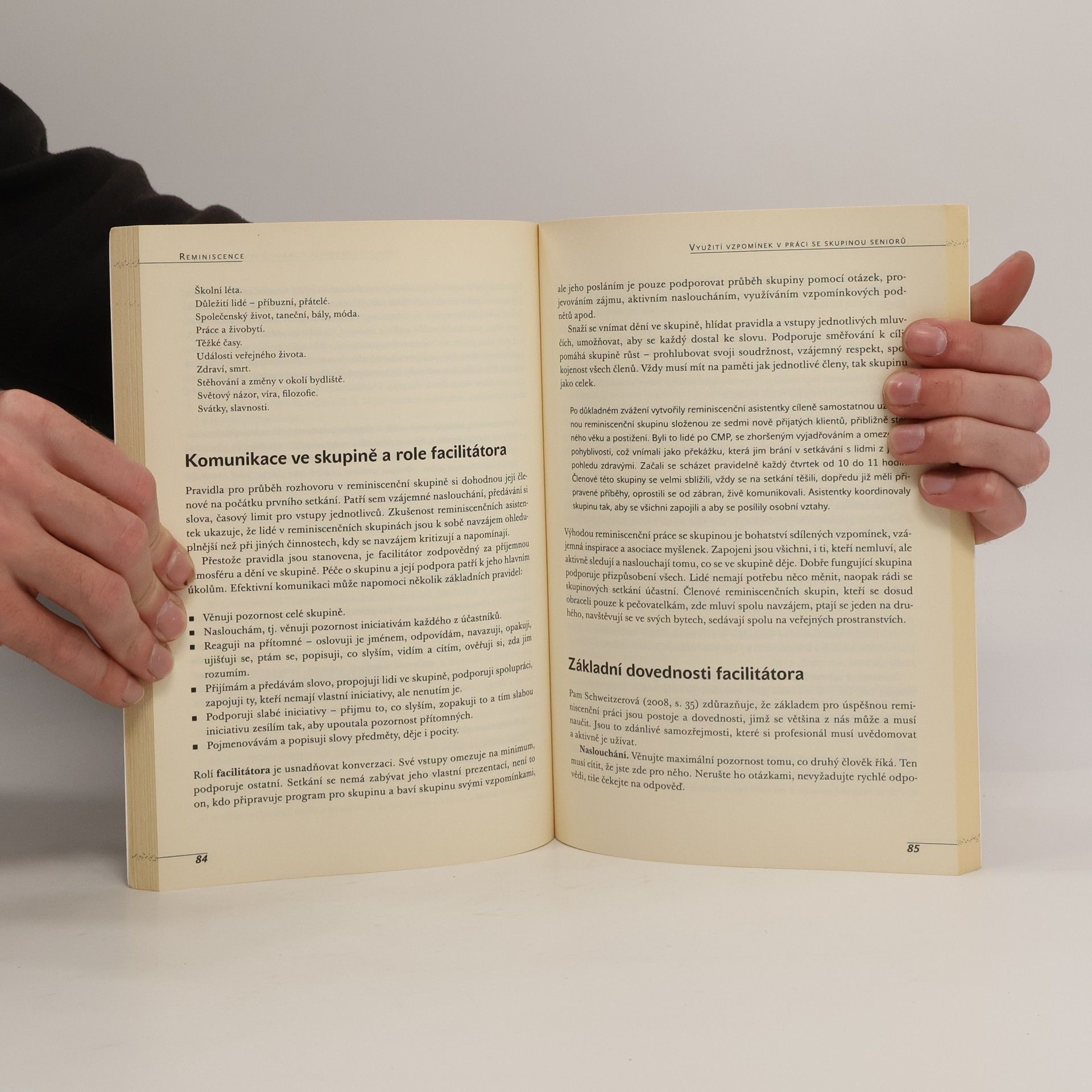 Využití vzpomínek při práci se seniory Jako reminiscenční terapie je obvykle označován rozhovor terapeuta se starším člověkem (nebo skupinou seniorů) o jeho dosavadním životě, jeho dřívějších aktivitách, prožitých událostech a zkušenostech. Autorky v knize popisují základní reminiscenční techniky – vzpomínání ve skupině, vzpomínkové boxy, knihy života, reminiscenční divadlo. Upozorňují na význam vzpomínkových podnětů a volby témat vzpomínání, analyzují různé přístupy v práci s reminiscencí, zabývají se významem osobnosti člověka ve vztahu ke vzpomínání. Velký důraz kladou na vytváření podmínek pro využití reminiscenčních přístupů v institucích pro seniory, kde tato dimenze lidského života bývá opomíjena.