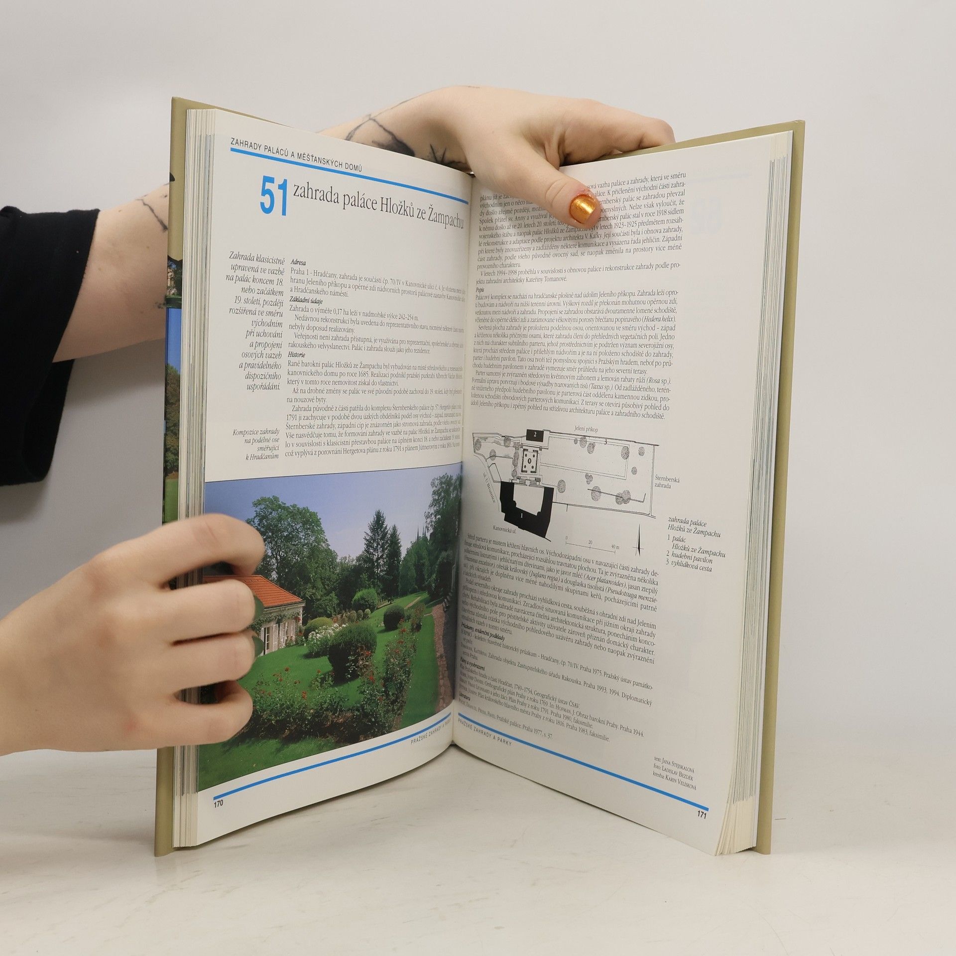 Kniha obsahuje 130 jednotně strukturovaných textů, doplněných barevnými fotografiemi a podrobnými schématy. Za názvem následuje stručná slohová a výrazová charakteristika díla, faktografické údaje, historický vývoj, popis kompozice a významných architektonických, dendrologických a uměleckých prvků. Hesla uzavírají informace o existujících dokumentačních materiálech a literatuře. Publikace zahrnuje díla, která patří do okruhu památek zahradního umění. Přehledu významných zahradních teritorií předchází kapitola věnovaná počátkům a vývoji zahradního umění v Praze. Je vybavena rejstříkem zahrad a parků, rejstříkem rostlin, jmenným rejstříkem a souhrnnou bibliografií. Materiál je zpracován z hlediska zahradního architekta, historika a památkáře.... celý text