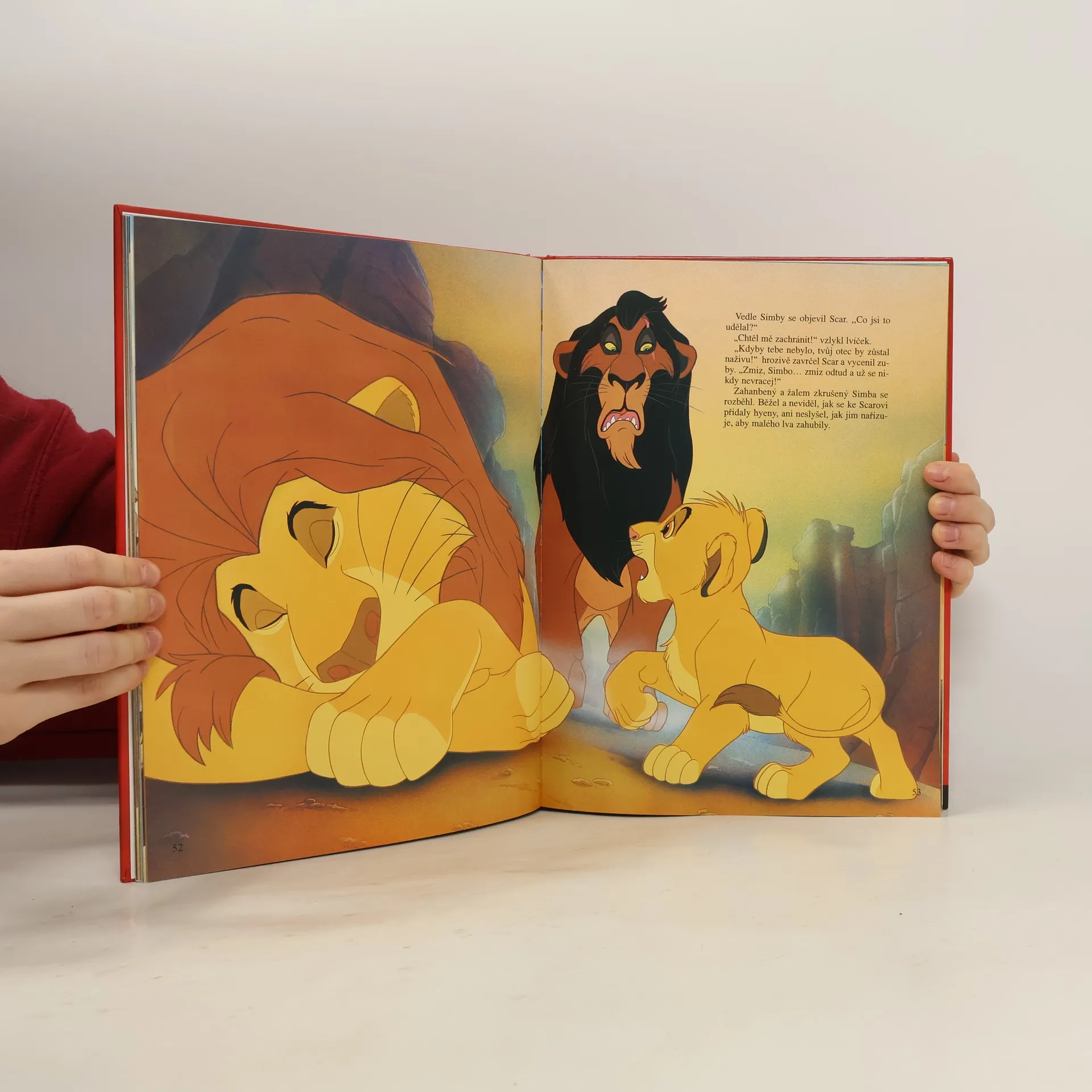 Oranžový kotouč slunce nahlédl prvními žhavými paprsky do nekonečné země písku, skal a stepní trávy a nad tím dílem světa, který lidé pokřtili jménem Afrika, se rozezněly tisíce bubnů a bubínků. Ale to nebouřily bubny! To dusala kopyta zeber a žiraf a dupaly mohutné sloní nohy. A nad bubny vřískaly a pípaly hlasy tisícihlavého sboru dalších zvířat. Všechna spěchala, aby se poprvé poklonila prvorozenému synu lvího krále Mufasy