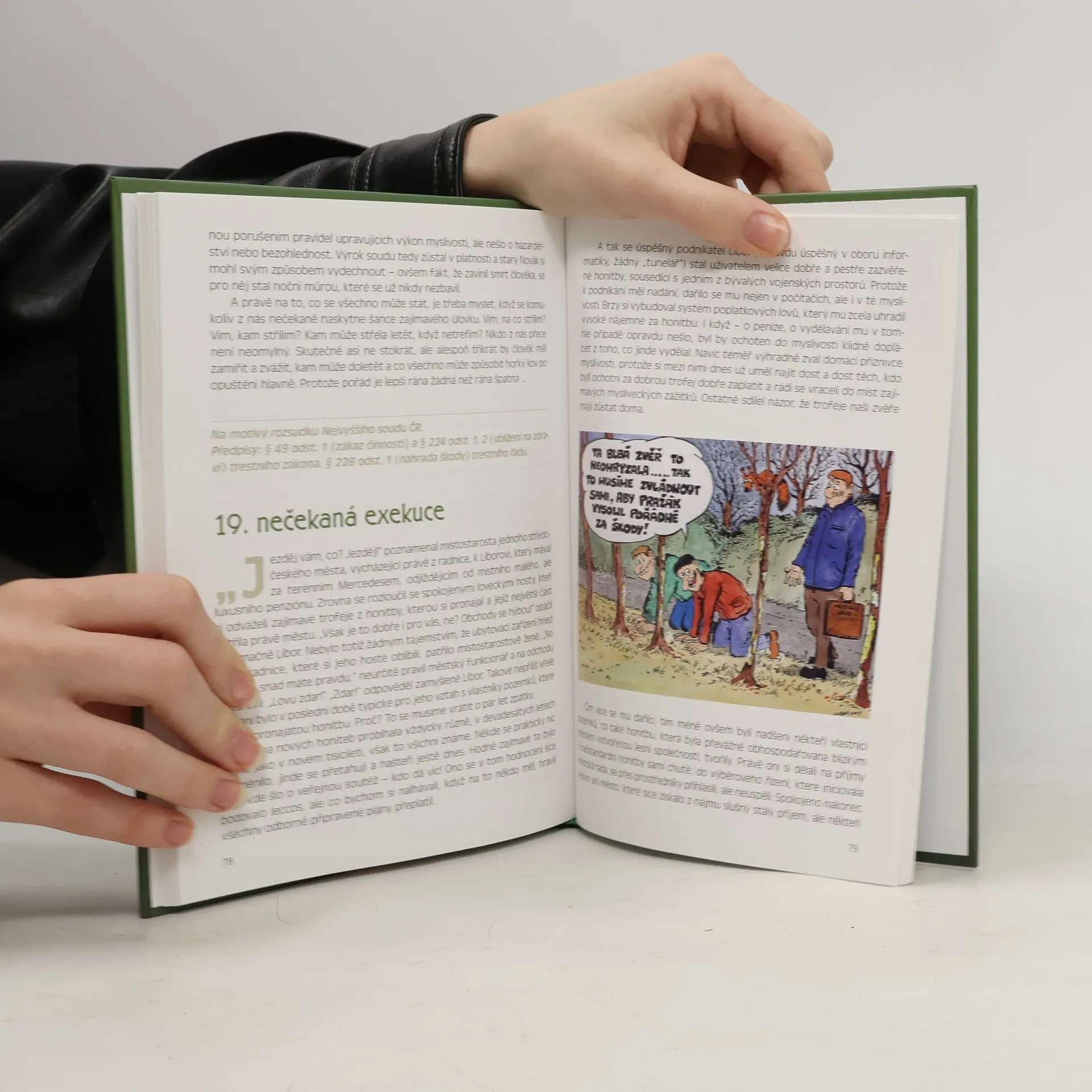Humorné minisoudničky Jaroslava Šprongla ilustrované kreslířem Petrem Slabou vycházejí poprvé knižně v pěkné publikaci v nakladatelství Rembrandt s.r.o. Projekt vznikl před pěti lety na základě všeobecně známého faktu, že se naši myslivci ne vždy zcela přesně orientují v měnící se legislativě. Vzhledem ke vzrůstajícímu zájmu o tuto problematiku, došel autorský tým k rozhodnutí vydat publikaci, která může zábavnou formou výrazně přispět k právnímu vědomí naší myslivecké veřejnosti, pokud jde o legislativu s myslivostí a spřízněnými obory související. U každého "případu" je v závěru uveden zdroj i příslušná ustanovení zákona o myslivosti, případně dalších souvisejících právních předpisů, která se ho týkají, čímž se z knížky stává i vhodná "příručka" pro myslivecké hospodáře a předsedy mysliveckých sdružení a honebních společenstev nebo i pro pracovníky státní správy na úseku myslivosti všech stupňů.Formát: A5, rozsah: 112 plnobarevných stran na křídovém papíře, Vazba: knižní, se záložkou a barevnou obálkou.