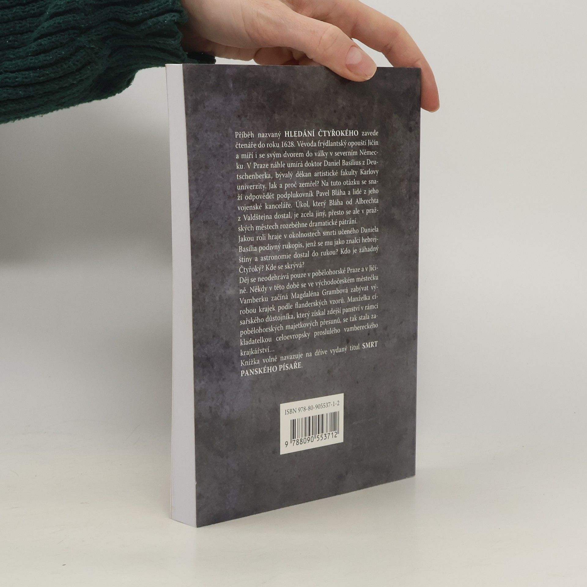 Příběh nazvaný Hledání Čtyřokého zavede čtenáře do roku 1628. Vévoda frýdlantský opouští Jičín a míří i se svým dvorem do války v severním Německu. V Praze náhle umírá doktor Daniel Basilius z Deutschenberka, bývalý děkan artistické fakulty Karlovy univerzity. Jak a proč zemřel? Kdo je záhadný Čtyřoký? Na tyto otázky se snaží odpovědět podplukovník Pavel Bláha a lidé z jeho vojenské kanceláře. Děj se neodehrává pouze v pobělohorské Praze a v Jičíně. Ve východočeském městečku Vamberku se právě v této době začíná Magdaléna Grambová zabývat výrobou krajek podle flanderských vzorů. Manželka císařského důstojníka, který získal panství v rámci pobělohorských majetkových přesunů, se tak stala zakladatelkou celoevropsky proslulého vambereckého krajkářství… Knížka volně navazuje na dříve vydaný titul Smrt panského písaře.