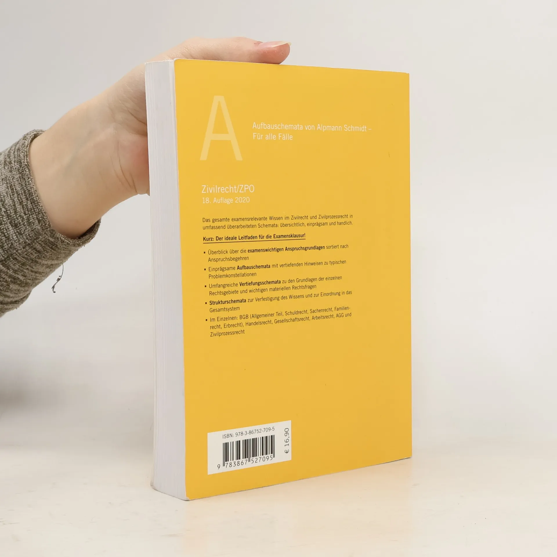 VorteileÜberblick über die examenswichtigen Anspruchsgrundlagen sortiert nach AnspruchsbegehrenEinprägsame Aufbauschemata mit vertiefenden Hinweisen und typischen ProblemkonstellationenUmfangreiche Vertiefungsschemata zu den Grundlagen der einzelnen Rechtsgebiete und wichtigen materiellen RechtsfragenStrukturschemata zur Vertiefung und Verfestigung des WissensDer ideale Leitfaden für die Examensklausur! Zur Reihe Die Aufbauschemata überzeugen durch ihre leichte Handhabung, da die intuitive Gliederungstechnik es Ihnen ermöglicht, das Verhältnis der einzelnen Merkmale auf einen Blick zu erfassen. Darüber hinaus überzeugt die Übersichtlichkeit aufgrund des einheitlichen Aufbaus. Zum Werk Das gesamte examensrelevante Wissen im Zivilrecht und Zivilprozessrecht in umfassend überarbeiteten Schemata unter Berücksichtigung der neuesten Rechtsprechung/Literatur und dem aktuellen Gesetzesstand: übersichtlich, einprägsam, handlich! BGB (Allgemeiner Teil, Schuldrecht, Sachenrecht, Familienrecht, Erbrecht)HandelsrechtGrundrechteGesellschaftsrechtArbeitsrechtAllgemeines GleichbehandlungsgesetzZivilprozessrecht Zielgruppe Studierende und Referendare