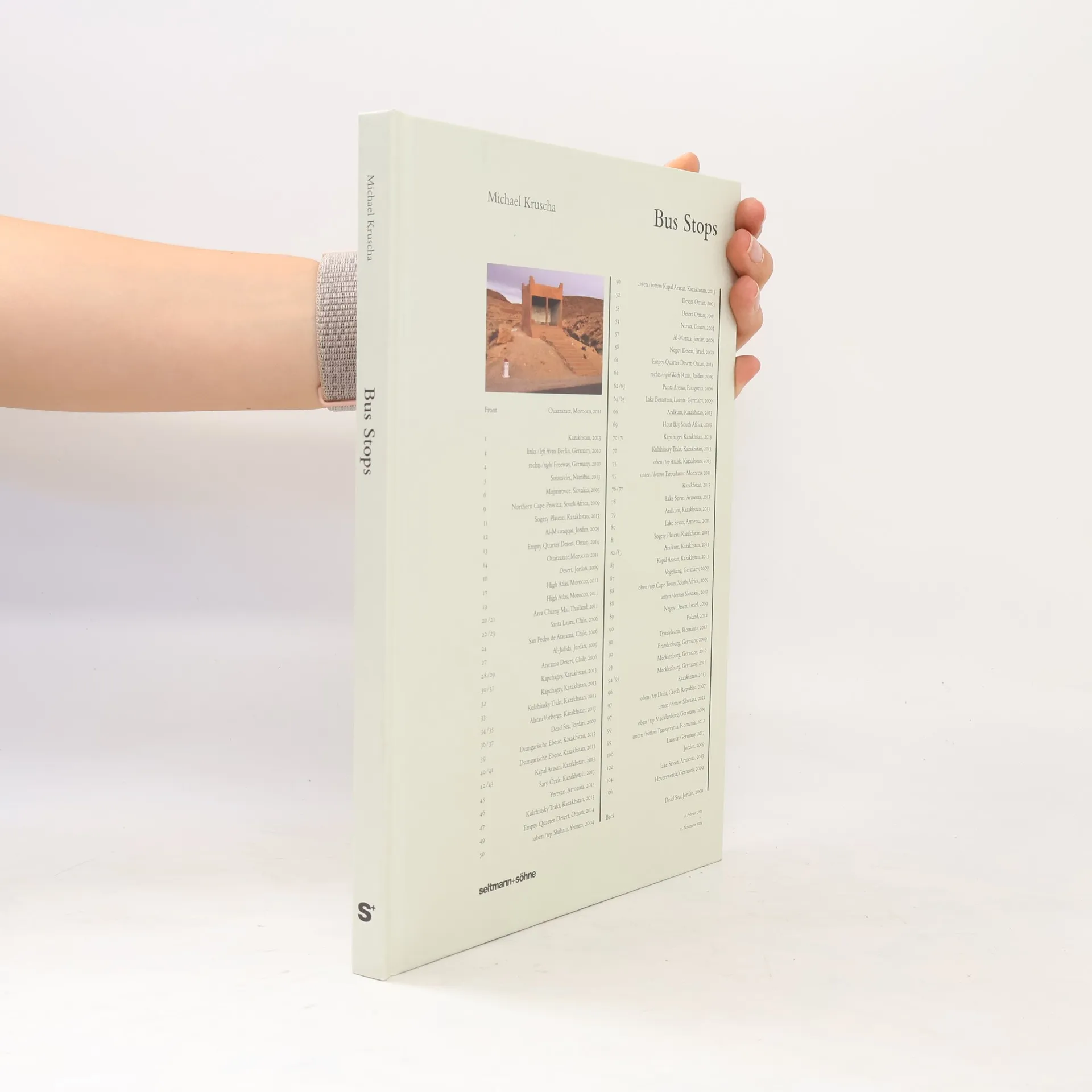 Der Bildband präsentiert eine Serie von Bushaltestellen, die Michael Kruscha auf Reisen fotografiert hat. Die Aufnahmen stammen aus Osteuropa, Kasachstan/Armenien, Arabien/Naher Osten, Nord- und Südafrika, Südamerika und Asien. Ausgangspunkt war eine Reise in den Oman, wo dem Künstler an Hunderte Kilometer langen Wüstenstraßen bus stops begegneten. Sie wirken paradox: Das zum Warten gebaute Gebilde erscheint seiner Funktion beraubt, ein L’art-pour-l’art-Produkt? Umso erstaunlicher ist die Gestaltung. Die kleinen Profanbauten variieren in Material, Gestalt und Zustand: teils zwischen dekorativer Baukunst und futuristischer Plastik, mit Relief, Malerei oder Mosaik, geometrisch reduziert sowie mit Ornamentik oder Figuren verziert. Einige sind seriell, andere individuell produziert, manche palastartig und kunstvoll, einzelne provisorisch errichtet oder halb verfallen. In dem Bildband wechseln Großaufnahmen stimmungsvoller Landschaften und außergewöhnliche Details, malerische Farbübergänge und kontrastreiche Bildkompositionen. Kunsthistorische Darstellung, ein Interview mit dem Künstler und Zitate namhafter Autoren intensivieren das Reiseerlebnis. Der Betrachter ist fasziniert vom ästhetischen Reiz fremder Landschaften sowie von der Vielfalt internationaler Baustile, die hier auf einzigartige Weise verschmelzen.