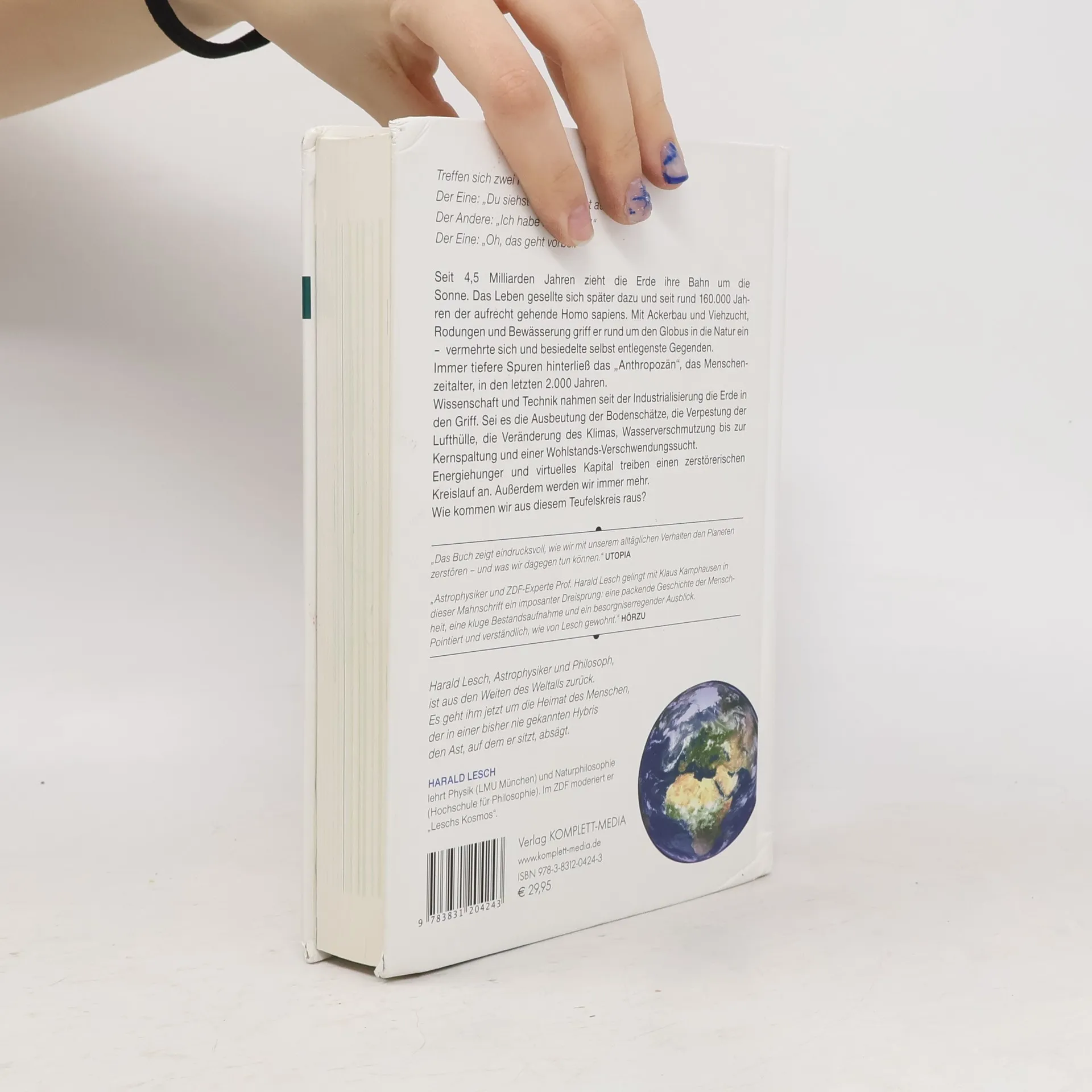 Seit 4,5 Milliarden Jahren zieht die Erde ihre Bahn um die Sonne. Das Leben gesellte sich später dazu und seit rund 160.000 Jahren der aufrecht gehende Homo sapiens, der Mensch. Mit Ackerbau und Viehzucht, Rodungen und Bewässerung griff er rund um den Globus in die Natur ein vermehrte sich und besiedelte selbst entlegenste Gegenden. Immer tiefere Spuren hinterließ das Anthropozän , das Menschenzeitalter, in den letzten 2.000 Jahren. Wissenschaft und Technik nahmen seit der Industrialisierung die Erde in den Griff. Sei es die Ausbeutung der Bodenschätze, die Verpestung der Lufthülle, die Veränderung des Klimas, Wasserverschmutzung bis zur Kernspaltung und einer Wohlstands-Verschwendungssucht. Energiehunger und virtuelles Kapital treiben einen zerstörerischen Kreislauf an. Harald Lesch, Astrophysiker und Philosoph, ist aus den Weiten des Weltalls zurück. Es geht ihm jetzt um die Heimat des Menschen, der in einer bisher nie gekannten Hybris den Ast, auf dem er sitzt, absägt. Treffen sich zwei Planeten. Der Eine: Oh, du siehst aber schlecht aus. Der Andere: Ich habe Menschen! Der Eine: Das geht vorbei.