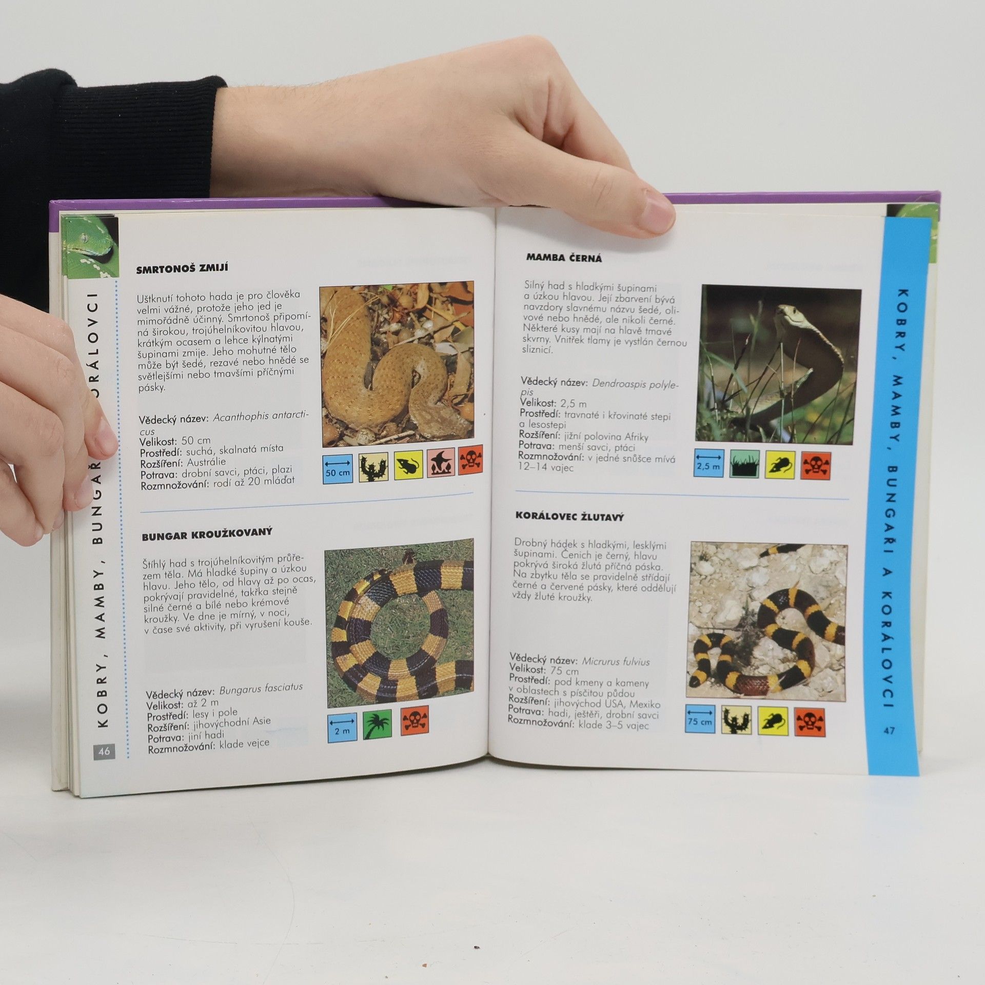 Barevný fotografický atlas hadů z celého světa seznamuje se zcela základními fakty o hadech a s jejich nejběžnějšími nebo nejzajímavějšími druhy. První část knihy informuje o hadech v historii lidstva, o evoluci a biologii hadů, o jejich smyslech a způsobu pohybu. Druhou část tvoří obrazový atlas se stručnými informacemi v podobě ikon a stručných textů.... celý text