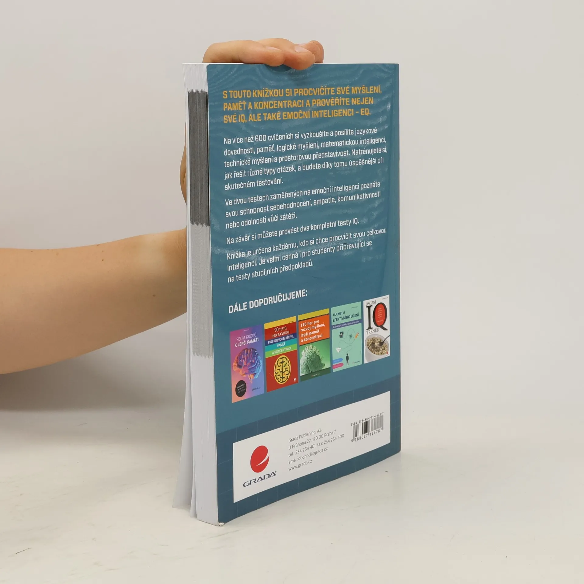 S touto knížkou si procvičíte své myšlení a zlepšíte nejen své IQ, ale také svou emoční inteligenci, tzv. EQ. Na více než 600 cvičeních si vyzkoušíte a posílíte jazykové dovednosti, paměť, logické a matematické myšlení a prostorové vnímání. Natrénujete si také, jak řešit různé typy otázek, a budete díky tomu úspěšnější při skutečném testování. Druhá část knížky nabízí cvičení zaměřené na EQ - od sebehodnocení, motivaci, empatii až po sociální dovednosti. Pomocí jednoduchých testů si rychle zkontrolujete své schopnosti a vlastnosti týkající se emoční inteligence. Na závěr si můžete provést dva komplexní testy IQ a prověřit si tak, co jste se naučili. Knížka je určena všem, kteří chtějí procvičovat svou celkovou inteligenci. Je velmi cenná pro studenty připravující se na testy studijních předpokladů.