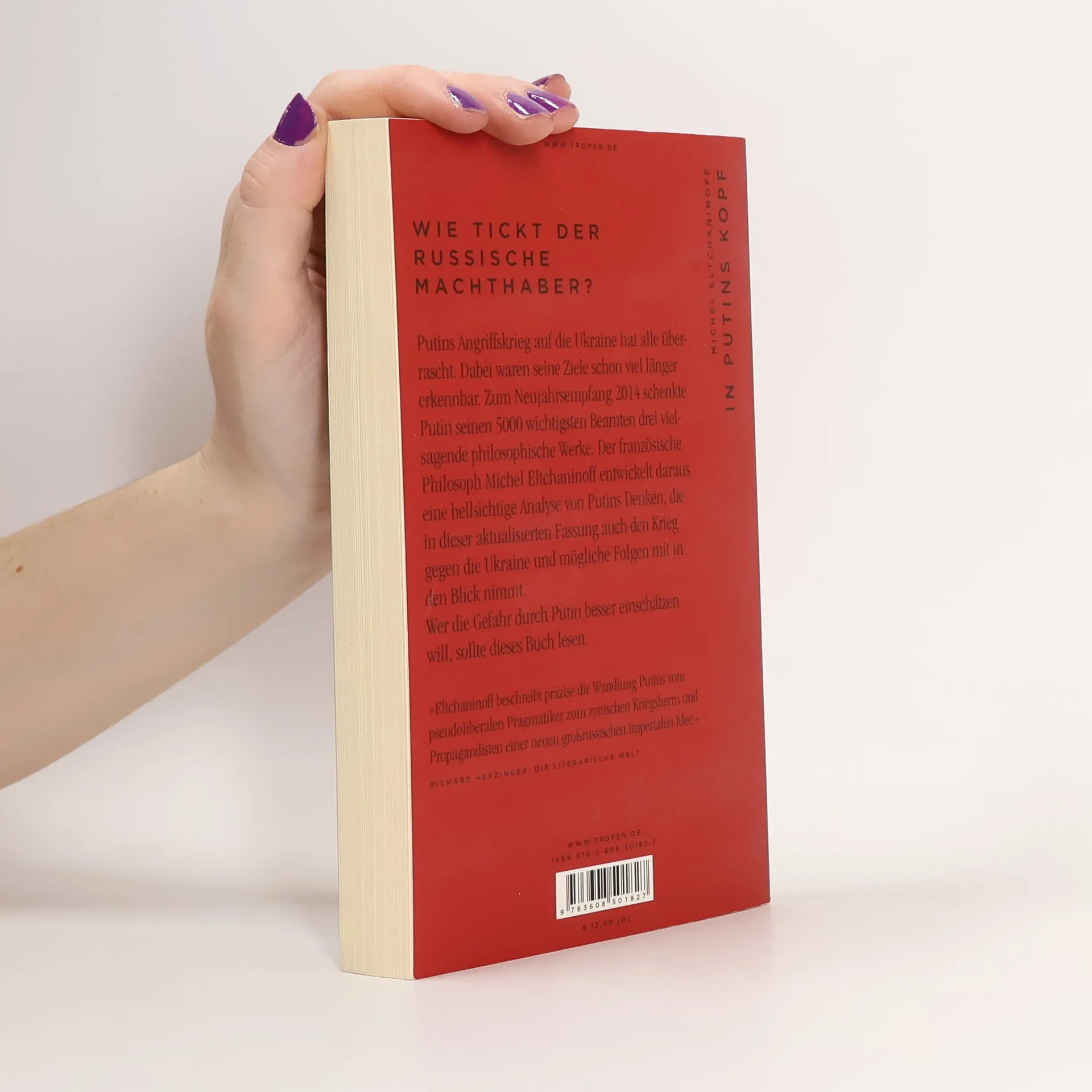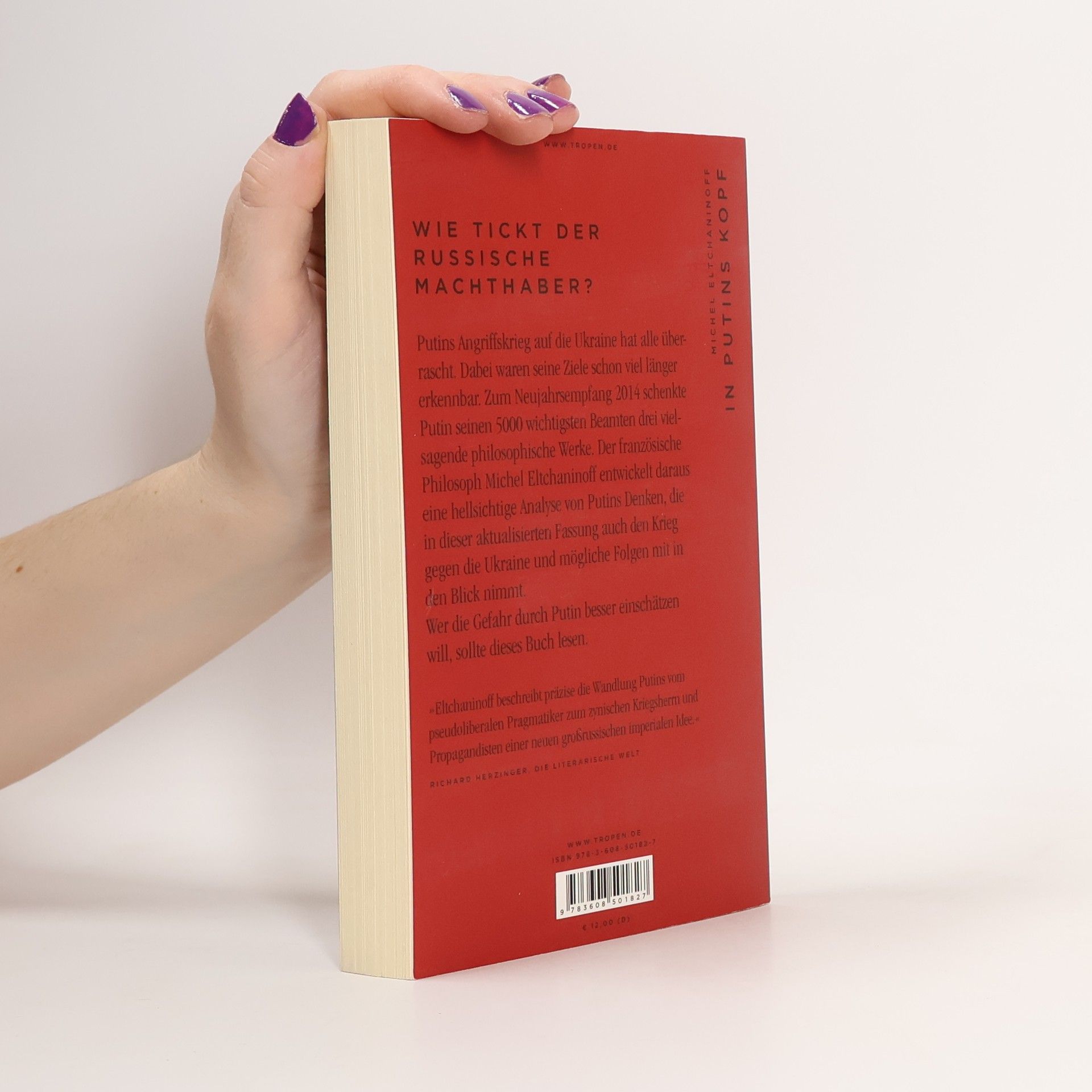 Aktualisierte Neuausgabe mit Zusatzkapitel zum Ukraine-Krieg Wer die Gefahr durch Putin besser einschätzen will, sollte dieses Buch lesen. Putins Angriffskrieg auf die Ukraine hat alle überrascht. Dabei waren seine Ziele schon viel länger erkennbar. Zum Neujahrsempfang 2014 schenkte Putin seinen 5000 wichtigsten Beamten drei vielsagende philosophische Werke. Der französische Philosoph Michel Eltchaninoff entwickelt daraus eine hellsichtige Analyse von Putins Denken. Mit einer kruden Mischung aus Logik und Willkür und auf der Grundlage eines rückwärtsgewandten Weltbilds soll ein eurasisches Großreich unter russischer Hegemonie entstehen. »Eltchaninoff beschreibt präzise die Wandlung Putins vom pseudoliberalen Pragmatiker zum zynischen Kriegsherrn und Propagandisten einer neuen großrussischen imperialen Idee.« Die literarische Welt »Eine intellektuelle Biographie dieses Profis der Maskierung.« Frankfurter Allgemeine Zeitung »Die kleine Studie erklärt gut, in welchem geistigen Kräftefeld sich der russische Präsident bewegt. Natürlich ist Putin kein Intellektueller; er liest Bücher mit bewaffnetem Auge und nimmt sich je nach Weltlage die philosophischen Brocken, die er braucht.« Die Zeit