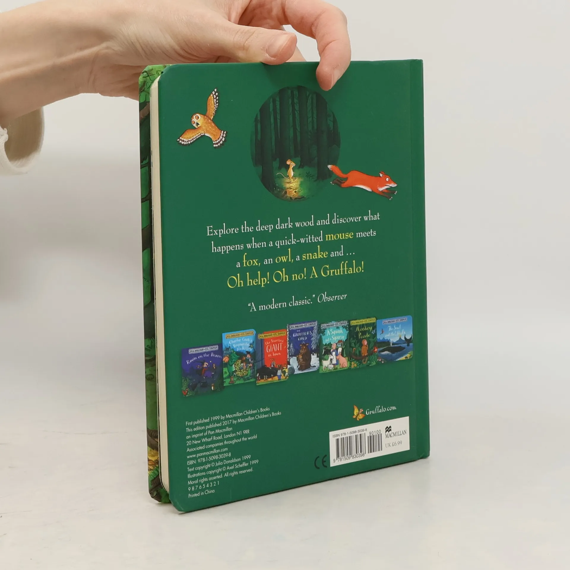 The nation's favourite bedtime story, now in a classic board book format with a fresh cover design!"A mouse took a stroll through the deep dark wood, A fox saw the mouse and the mouse looked good." Walk further into the deep dark wood, and discover what happens when a quick-witted mouse comes face to face with an owl, a snake... and a hungry Gruffalo! Julia Donaldson and Axel Scheffler's The Gruffalo is an undisputed modern classic and has become a best-selling phenomenon across the world with over 13.5 million copies sold. This award-winning rhyming story of a mouse and a monster has found its way into the hearts and bedtimes of an entire generation of children and will undoubtedly continue to enchant children for years and years to come. No home should be without The Gruffalo! This handy board book format is perfect for younger readers. It features the classic story with a stunning redesigned cover and beautiful finish, making it a must-have for even the smallest Donaldson and Scheffler fans! Also available in board book format and with striking redesigned covers are: The Gruffalo's Child, Room on the Broom, The Snail and the Whale, The Smartest Giant in Town, Monkey Puzzle, Charlie Cook's Favourite Book, and A Squash and a Squeeze.