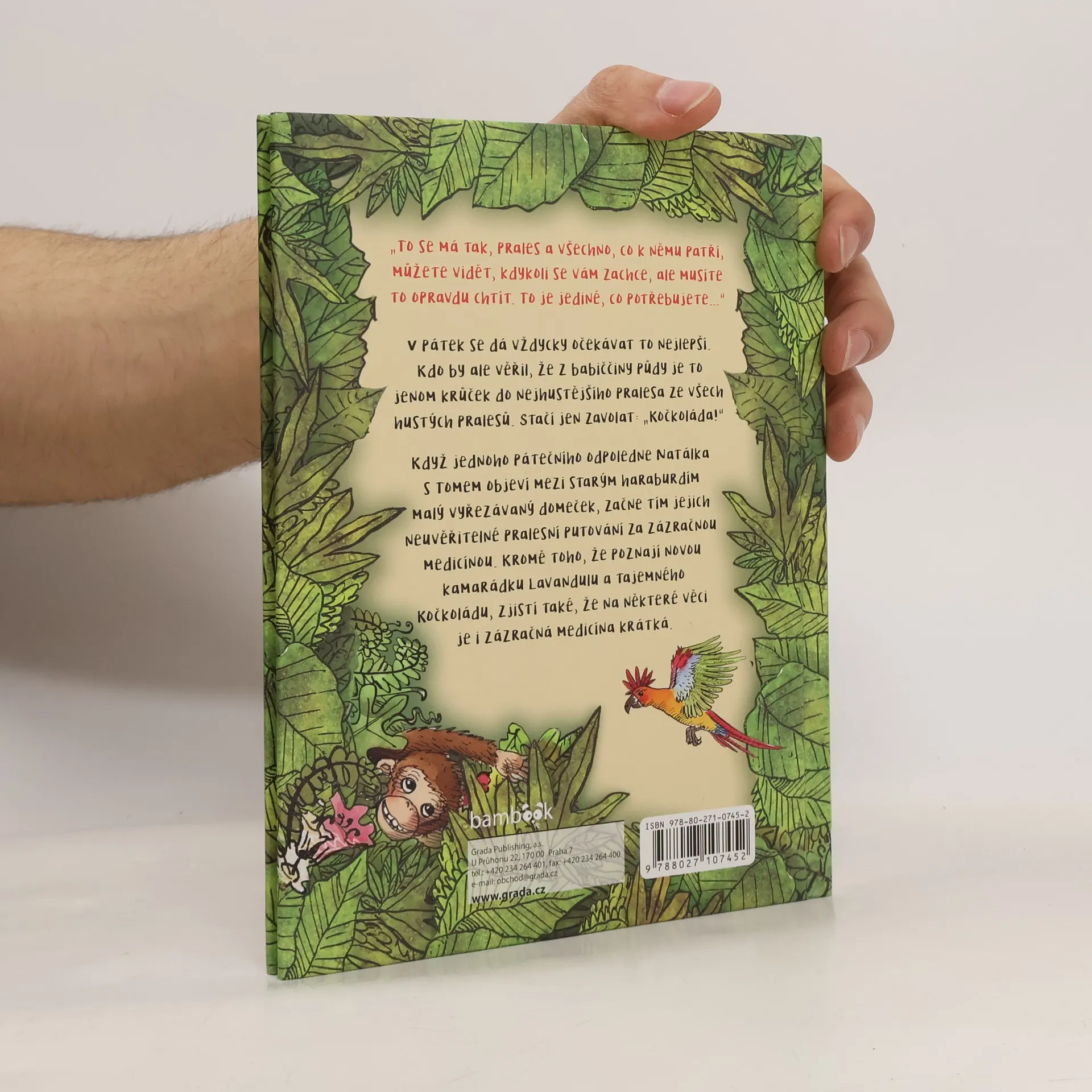 V pátek se dá vždycky očekávat to nejlepší. Kdo by ale věřil, že z babiččiny půdy je to jenom krůček do nejhustějšího pralesa ze všech hustých pralesů. Stačí jen zavolat: „Kočkoláda!“ Když jednoho pátečního odpoledne Natálka s Tomem objeví mezi starým haraburdím malý vyřezávaný domeček, začne tím jejich neuvěřitelné pralesní putování za zázračnou medicínou. Kromě toho, že poznají novou kamarádku Lavandulu a tajemného Kočkoládu, zjistí také, že na některé věci je i zázračná medicína krátká. Příběh jako vystřižený z toho nejbláznivějšího snu doprovodila ilustracemi oblíbená ilustrátorka Markéta Vydrová.