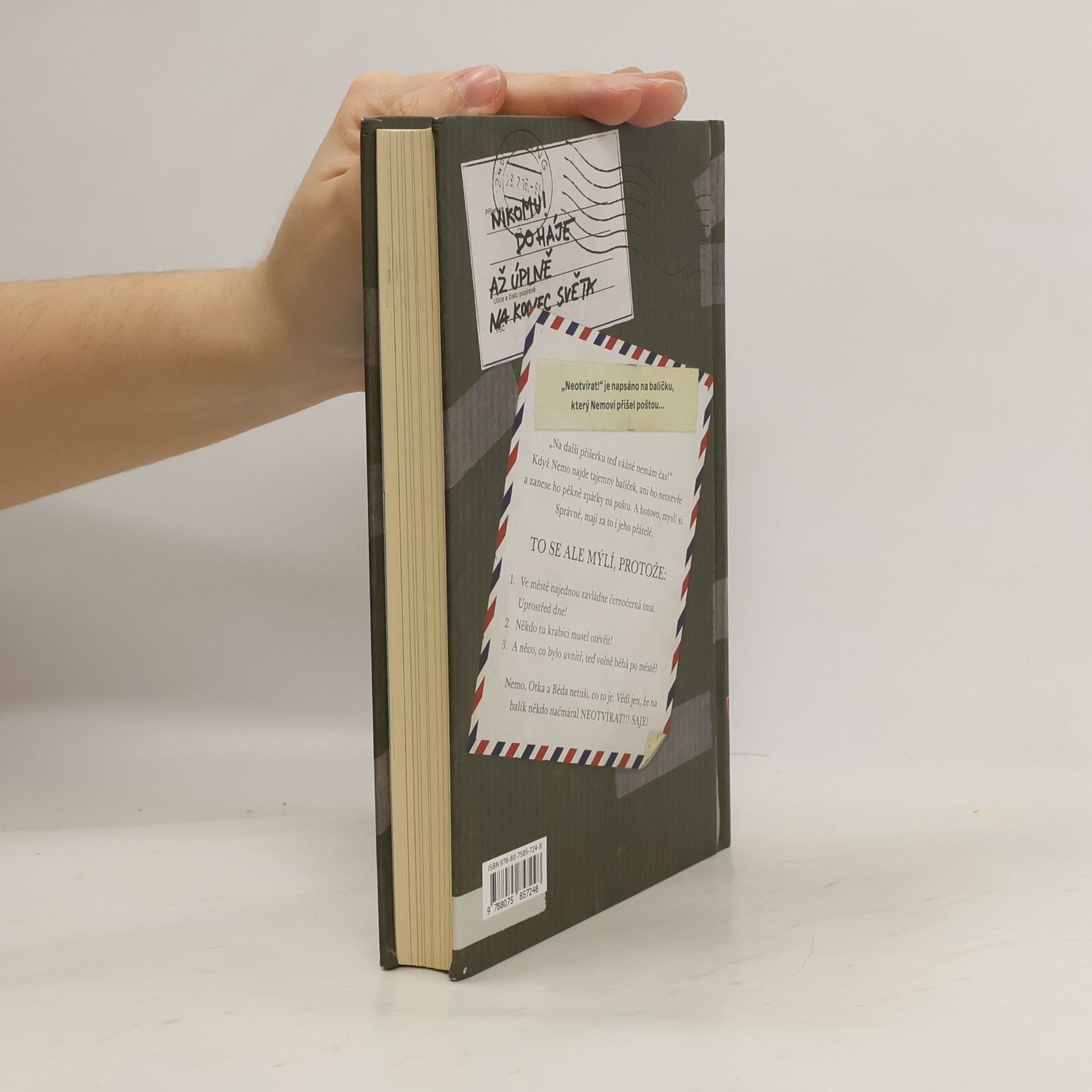 Nemo už toho má dost! Zrovna teď, když se musí učit na písemku z matematiky! Na další příšerku teď vážně nemá čas! Když zase u dveří najde balíček, ani ho neotevře a odnese ho zpátky na poštu. Správně, myslí si on i jeho kamarádi. Ve městě se přesto začnou dít neuvěřitelné věci. Horní Suchopár najednou pohltí černočerná tma. A nejen to. Někdo ten balíček musel otevřít! A to, co bylo uvnitř, teď běhá po městě! Nemo, Otka a Béda vůbec netuší, co to je. Vědí jen, že na balík někdo načmáral: „Neotvírat! Saje!“ Všichni dostanou strach. Co teď? První dva díly z řady Neotvírat! měly u dětských čtenářů úspěch. Teď je tu třetí díl. Tajemné, možná i trochu strašidelné dobrodružství tří přátel - Nema, Otky a Bédy, kteří se ze všech sil snaží zachránit město. Příběh o kamarádství a o věcech, které jsou opravdu důležité, potěší nejen dětské čtenáře. Svým vtipem a nezaměnitelnými ilustracemi Fréderica Bertranda kniha pobaví i rodiče, kteří při čtení na dobrou noc určitě neusnou...