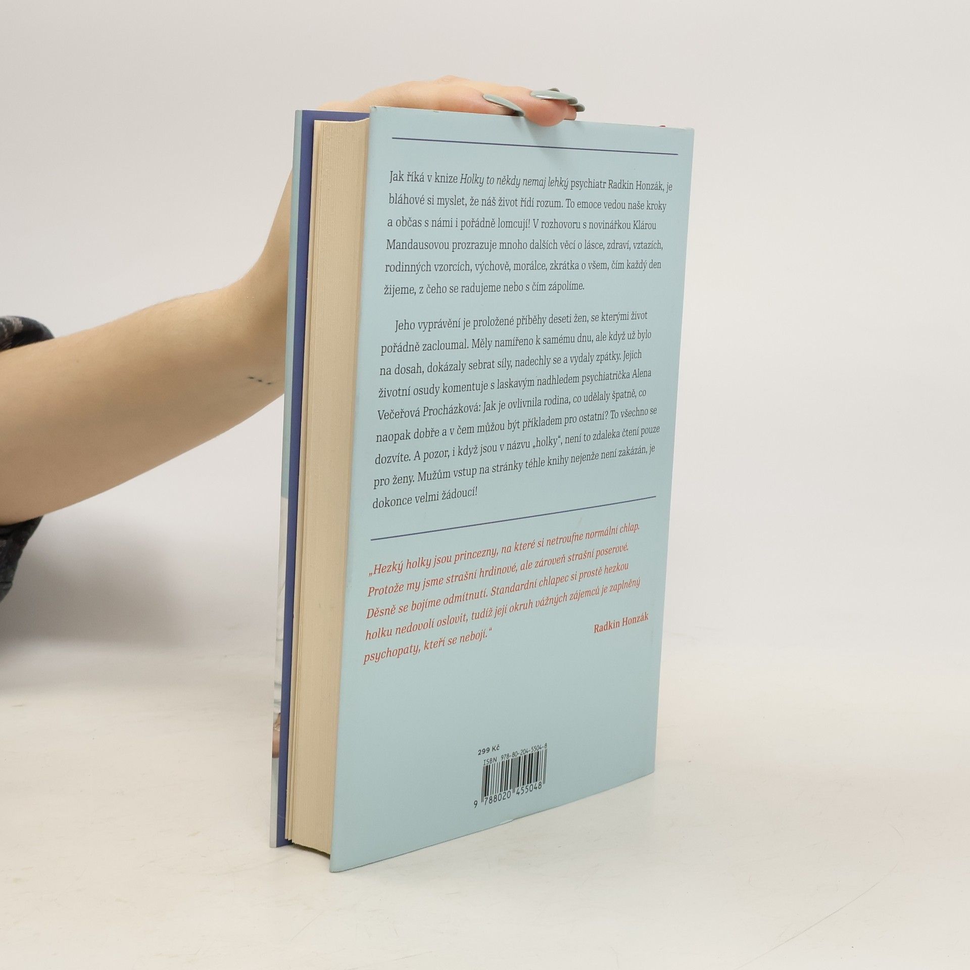 Říká se, že žena vydrží víc než kůň. A kolik toho vlastně vydrží kůň? Hodně, i když se někdy splaší, začne vyvádět a občas jde dokonce hlavou proti zdi. Ať to stojí, co to stojí. Jak říká v knize Holky to někdy nemaj lehký psychiatr Radkin Honzák, je bláhové si myslet, že náš život řídí rozum. Jsou to emoce, co vedou naše kroky a občas s námi i pořádně lomcují! V rozhovoru s novinářkou Klárou Mandausovou prozrazuje mnoho dalších věcí o lásce, zdraví, vztazích, rodinných vzorcích, výchově, morálce, zkrátka o všem, čím každý den žijeme, z čeho se radujeme nebo s čím zápolíme. Jeho vyprávění je proložené příběhy deseti žen, se kterými život pořádně zacloumal. Měly namířeno k samému dnu, ale když už bylo na dosah, dokázaly sebrat síly, nadechly se a vydaly zpátky. Jejich životní osudy komentuje s laskavým nadhledem psychiatrička Alena Večeřová Procházková: Jak je ovlivnila rodina, co udělaly špatně, co naopak dobře a v čem můžou být příkladem pro ostatní? To všechno se dozvíte. A pozor, i když jsou v názvu holky, není to zdaleka čtení pouze pro ženy. Mužům vstup na stránky téhle knihy nejenže není zakázán, je dokonce velmi žádoucí! Je vám, pánové, přece jasné, že rčení o koni a výdrži, platí i pro vás?