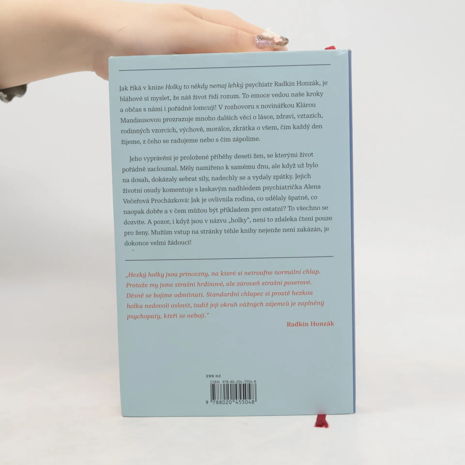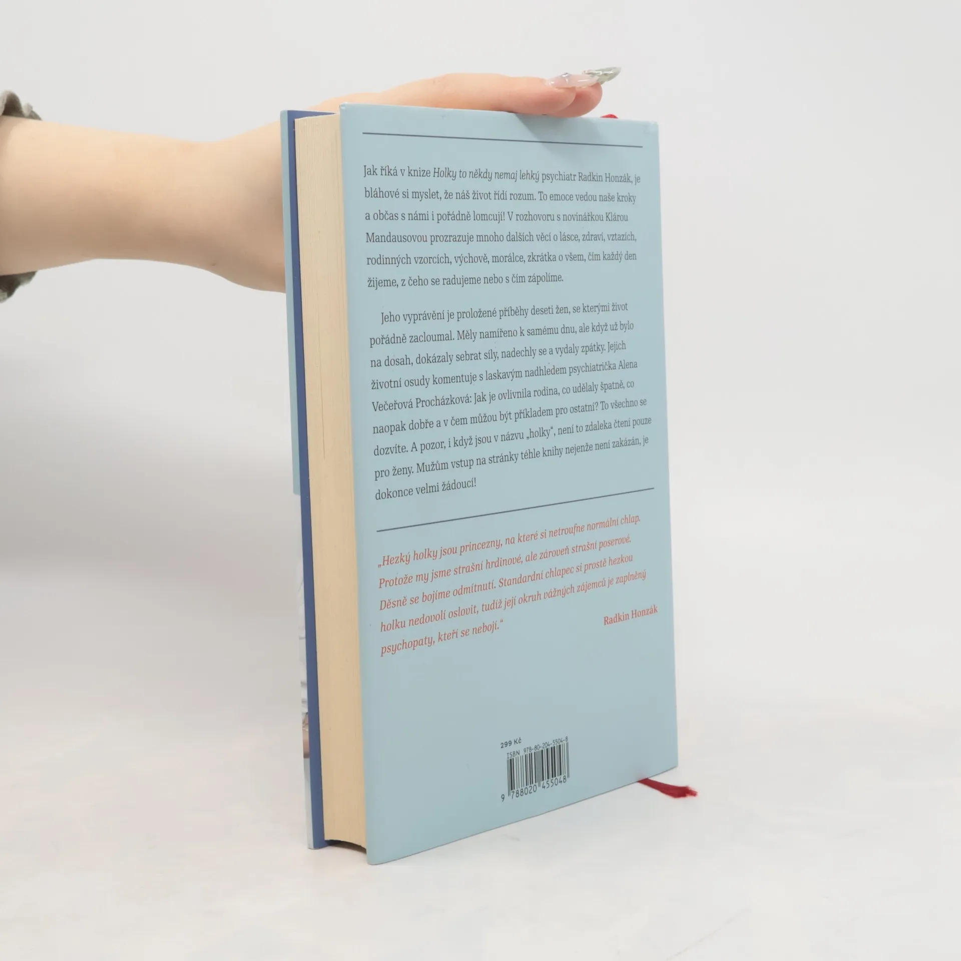 Říká se, že žena vydrží víc než kůň. A kolik toho vlastně vydrží kůň? Hodně, i když se někdy splaší, začne vyvádět a občas jde dokonce hlavou proti zdi. Ať to stojí, co to stojí. Jak říká v knize Holky to někdy nemaj lehký psychiatr Radkin Honzák, je bláhové si myslet, že náš život řídí rozum. Jsou to emoce, co vedou naše kroky a občas s námi i pořádně lomcují! V rozhovoru s novinářkou Klárou Mandausovou prozrazuje mnoho dalších věcí o lásce, zdraví, vztazích, rodinných vzorcích, výchově, morálce, zkrátka o všem, čím každý den žijeme, z čeho se radujeme nebo s čím zápolíme. Jeho vyprávění je proložené příběhy deseti žen, se kterými život pořádně zacloumal. Měly namířeno k samému dnu, ale když už bylo na dosah, dokázaly sebrat síly, nadechly se a vydaly zpátky. Jejich životní osudy komentuje s laskavým nadhledem psychiatrička Alena Večeřová Procházková: Jak je ovlivnila rodina, co udělaly špatně, co naopak dobře a v čem můžou být příkladem pro ostatní? To všechno se dozvíte. A pozor, i když jsou v názvu holky, není to zdaleka čtení pouze pro ženy. Mužům vstup na stránky téhle knihy nejenže není zakázán, je dokonce velmi žádoucí! Je vám, pánové, přece jasné, že rčení o koni a výdrži, platí i pro vás?