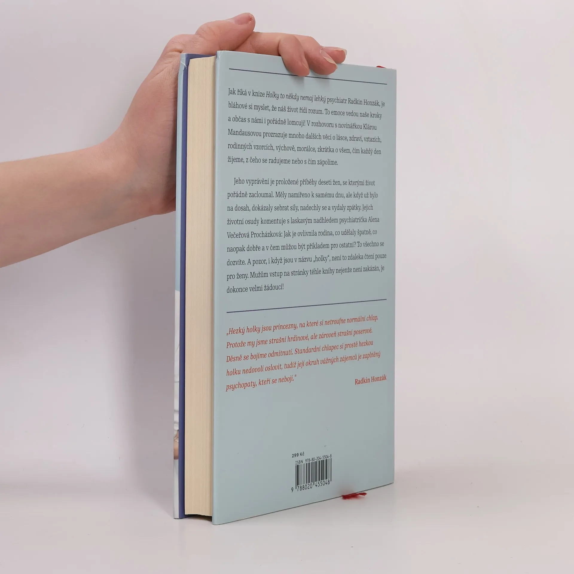 Říká se, že žena vydrží víc než kůň. A kolik toho vlastně vydrží kůň? Hodně, i když se někdy splaší, začne vyvádět a občas jde dokonce hlavou proti zdi. Ať to stojí, co to stojí. Jak říká v knize Holky to někdy nemaj lehký psychiatr Radkin Honzák, je bláhové si myslet, že náš život řídí rozum. Jsou to emoce, co vedou naše kroky a občas s námi i pořádně lomcují! V rozhovoru s novinářkou Klárou Mandausovou prozrazuje mnoho dalších věcí o lásce, zdraví, vztazích, rodinných vzorcích, výchově, morálce, zkrátka o všem, čím každý den žijeme, z čeho se radujeme nebo s čím zápolíme. Jeho vyprávění je proložené příběhy deseti žen, se kterými život pořádně zacloumal. Měly namířeno k samému dnu, ale když už bylo na dosah, dokázaly sebrat síly, nadechly se a vydaly zpátky. Jejich životní osudy komentuje s laskavým nadhledem psychiatrička Alena Večeřová Procházková: Jak je ovlivnila rodina, co udělaly špatně, co naopak dobře a v čem můžou být příkladem pro ostatní? To všechno se dozvíte. A pozor, i když jsou v názvu holky, není to zdaleka čtení pouze pro ženy. Mužům vstup na stránky téhle knihy nejenže není zakázán, je dokonce velmi žádoucí! Je vám, pánové, přece jasné, že rčení o koni a výdrži, platí i pro vás?