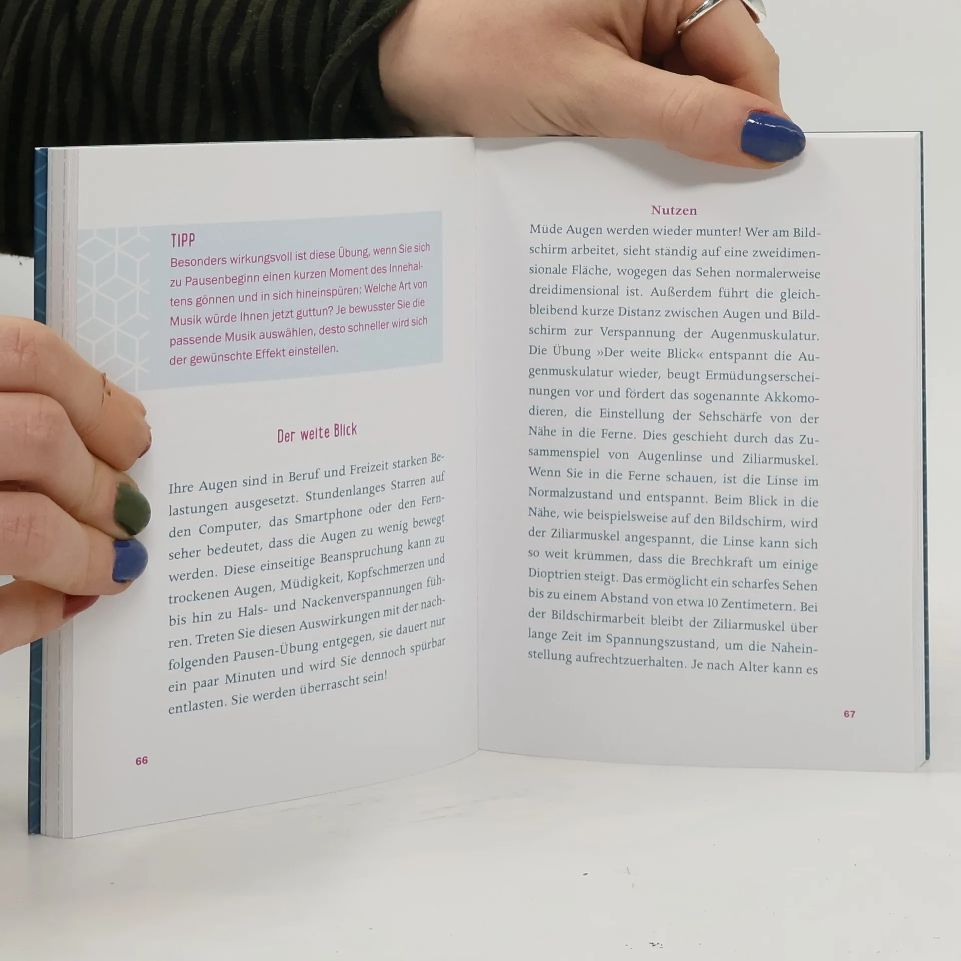 Coach und Yoga-Lehrerin Ulrike Reiche zeigt, wie kleine, eingestreute Pausen über den Tag verteilt werden können. Sie tragen wesentlich dazu bei, dass wir unsere Gesundheit erhalten und gelassener durchs Leben gehen. Nach aktuellen Untersuchungen verzichtet etwa jeder vierte Mitarbeiter auf Arbeitspausen. Bei denjenigen, die mehr als 48 Wochenstunden arbeiten, ist es sogar jeder zweite Beschäftigte! Häufig bewegen sich die Mitarbeiter in einem Spannungsfeld zwischen persönlichem Erholungsbedürfnis und hoch gesteckten Leistungszielen und drohen sich dabei zu überfordern oder gar krank zu werden. Eine aktiv gestaltete Erholungspause ist dagegen das beste Mittel gegen Burn-out und andere stressbedingte Krankheiten. Schon ein paar Minuten reichen, um etwas für die eigene Gesundheit zu tun. Die überwiegend meditativen Übungen helfen einem, bewusst zu entspannen, sich in Stresssituationen aktiv zu beruhigen und in kurzer Zeit frische Energie und Kreativität freizusetzen.