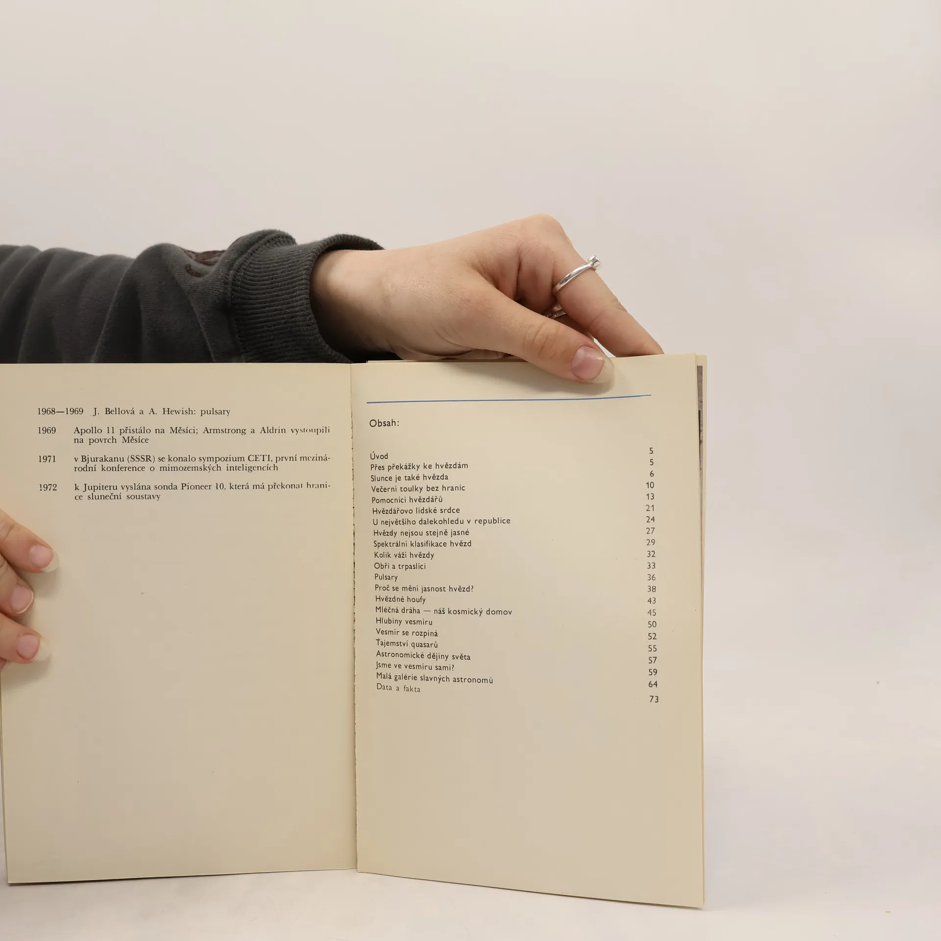 Populární knížka přibližuje zábavnou formou některé základní otázky astronomie. Vypráví o Slunci, o pozorování souhvězdí, o dalekohledech, spektrální klasifikaci hvězd, obřích a trpasličích hvězdách, pulsarech, Mléčné dráze, rozpínavosti vesmíru, o tajemství quasarů, o možnostech existence jiných civilizací aj.