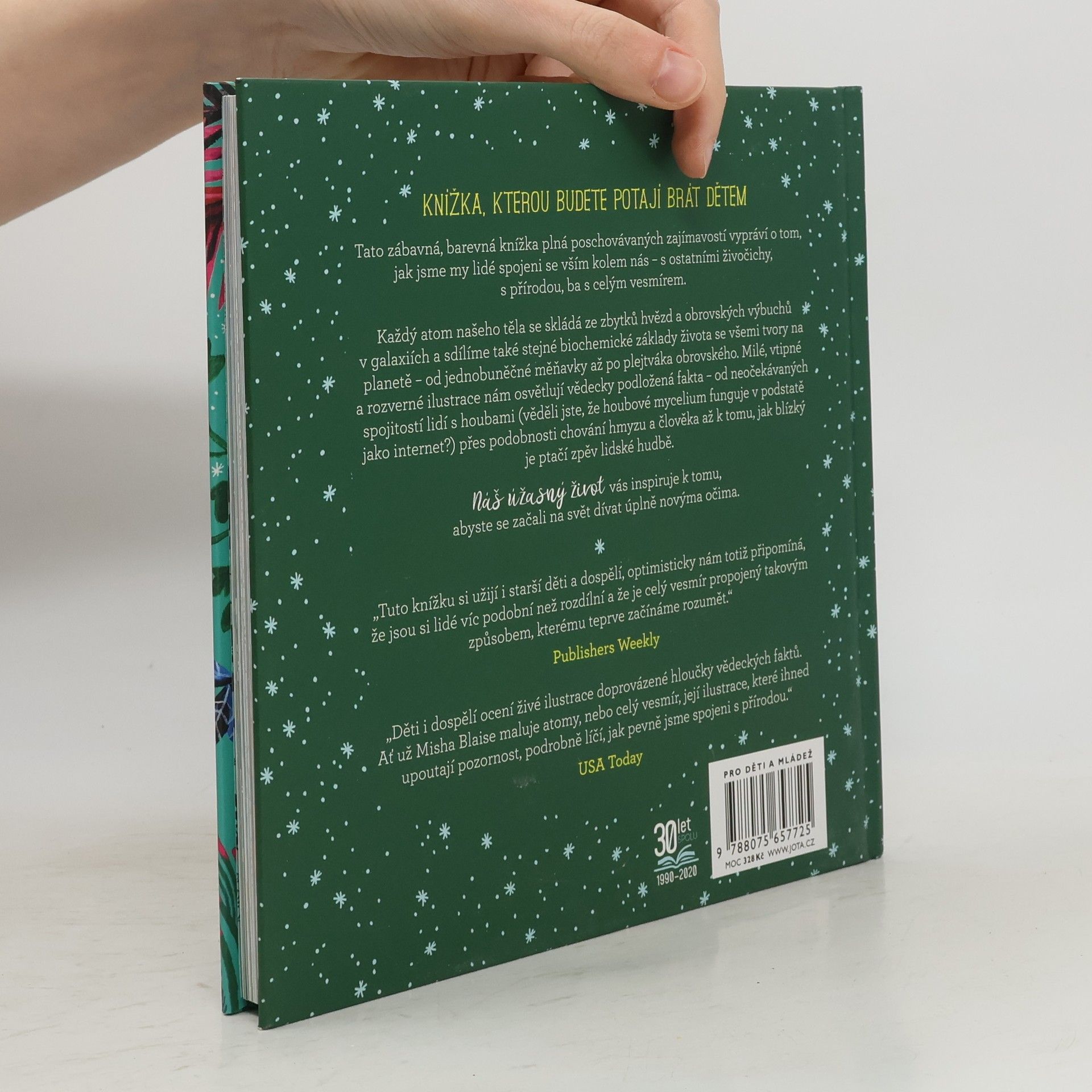 Tato zábavná, barevná knížka plná poschovávaných zajímavostí vypráví o tom, jak jsme my lidé spojeni se vším kolem nás – s ostatními živočichy, s přírodou, ba s celým vesmírem. Každý atom našeho těla se skládá ze zbytků hvězd a obrovských výbuchů v galaxiích a sdílíme také stejné biochemické základy života se všemi tvory na planetě – od jednobuněčné měňavky až po plejtváka obrovského. Milé, vtipné a rozverné ilustrace nám osvětlují vědecky podložená fakta – od neočekávaných spojitostí lidí s houbami (věděli jste, že houbové mycelium funguje v podstatě jako internet?) přes podobnosti chování hmyzu a člověka až k tomu, jak blízký je ptačí zpěv lidské hudbě. Náš úžasný život vás inspiruje k tomu, abyste se začali na svět dívat úplně novýma očima.