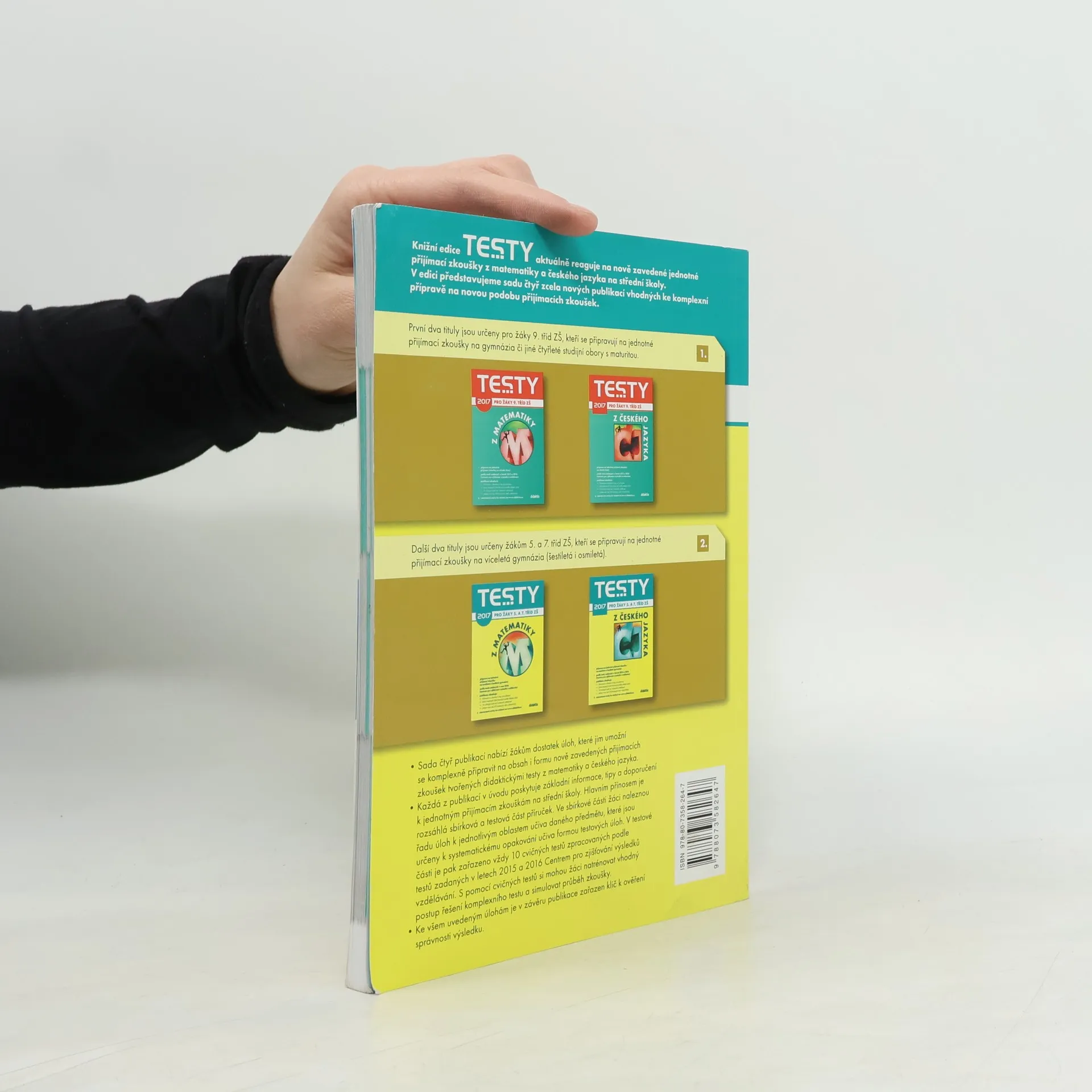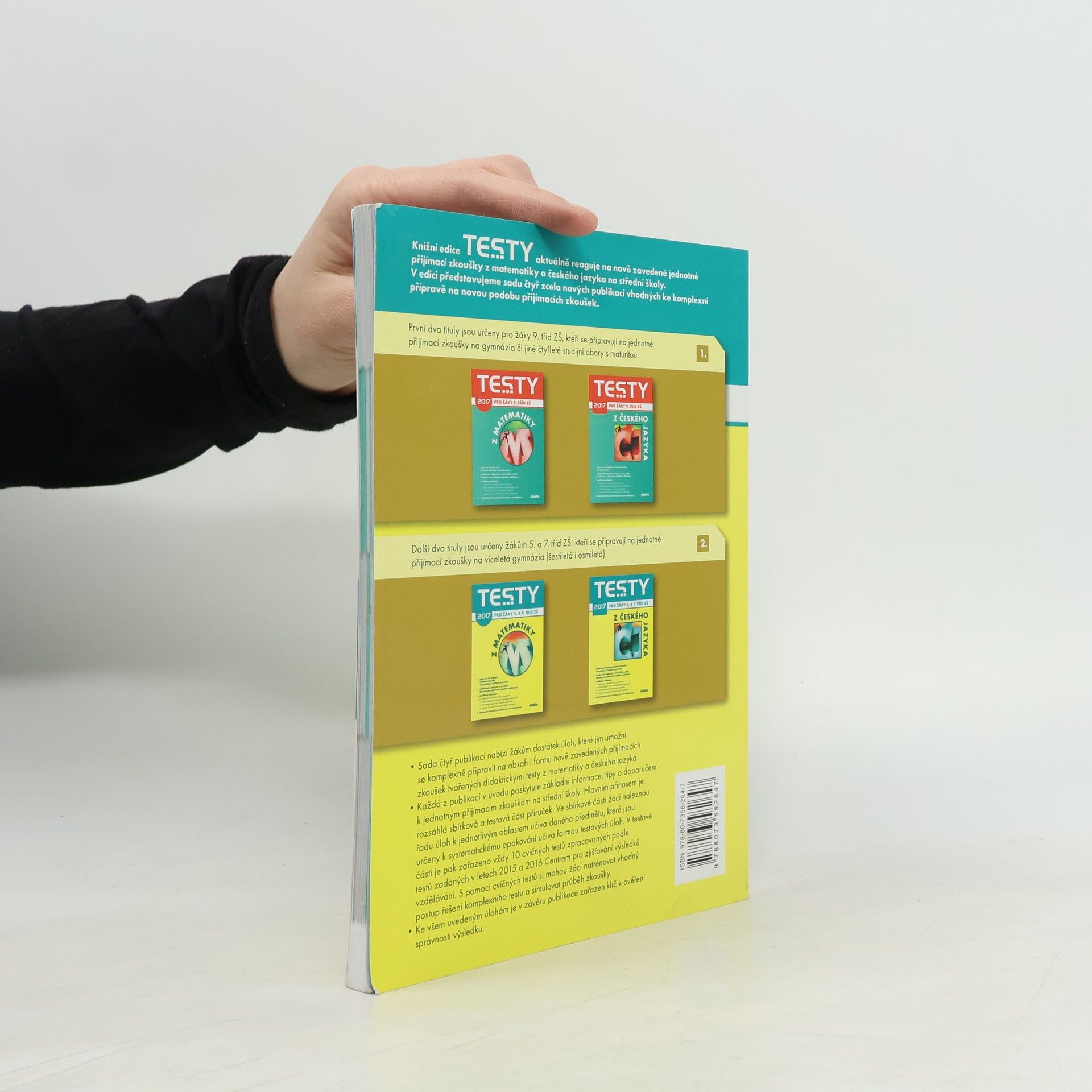 Příručka reaguje na novelu školského zákona vyhlášenou dne 8. 6. 2016 ve Sbírce zákonů v částce 68 pod číslem 178/2016 Sb., která zavádí jednotné přijímací zkoušky, a zohledňuje podobu testů vytvořených Centrem pro zjišťování výsledků vzdělávání (dříve CERMAT) v rámci pilotního ověřování organizace přijímacího řízení v roce 2015 a pokusného ověřování organizace přijímacího řízení v roce 2016. Publikace poskytuje základní informace, tipy a doporučení k jednotným přijímacím zkouškám na osmiletá i šestiletá gymnázia. Titul je sestaven podle platných RVP pro základní školy a Standardů pro základní vzdělávání. Testy připravují žáky na formu i obsah didaktického testu z matematiky. Sbírková část obsahuje přibližně 250 úloh na procvičení ke každé ze čtyř oblastí vymezených Standardy pro základní vzdělávání: • Číslo a početní operace • Závislosti, vztahy a práce s daty • Geometrie v rovině a prostoru • Nestandardní aplikační úlohy Úlohy odpovídají zadávaným typům úloh v didaktickém testu – výběr z pěti možností, svazek tří dichotomických úloh, přiřazovací úlohy, otevřené úlohy. Barevně odlišené jsou úlohy pro uchazeče o studium na šestiletých gymnáziích.