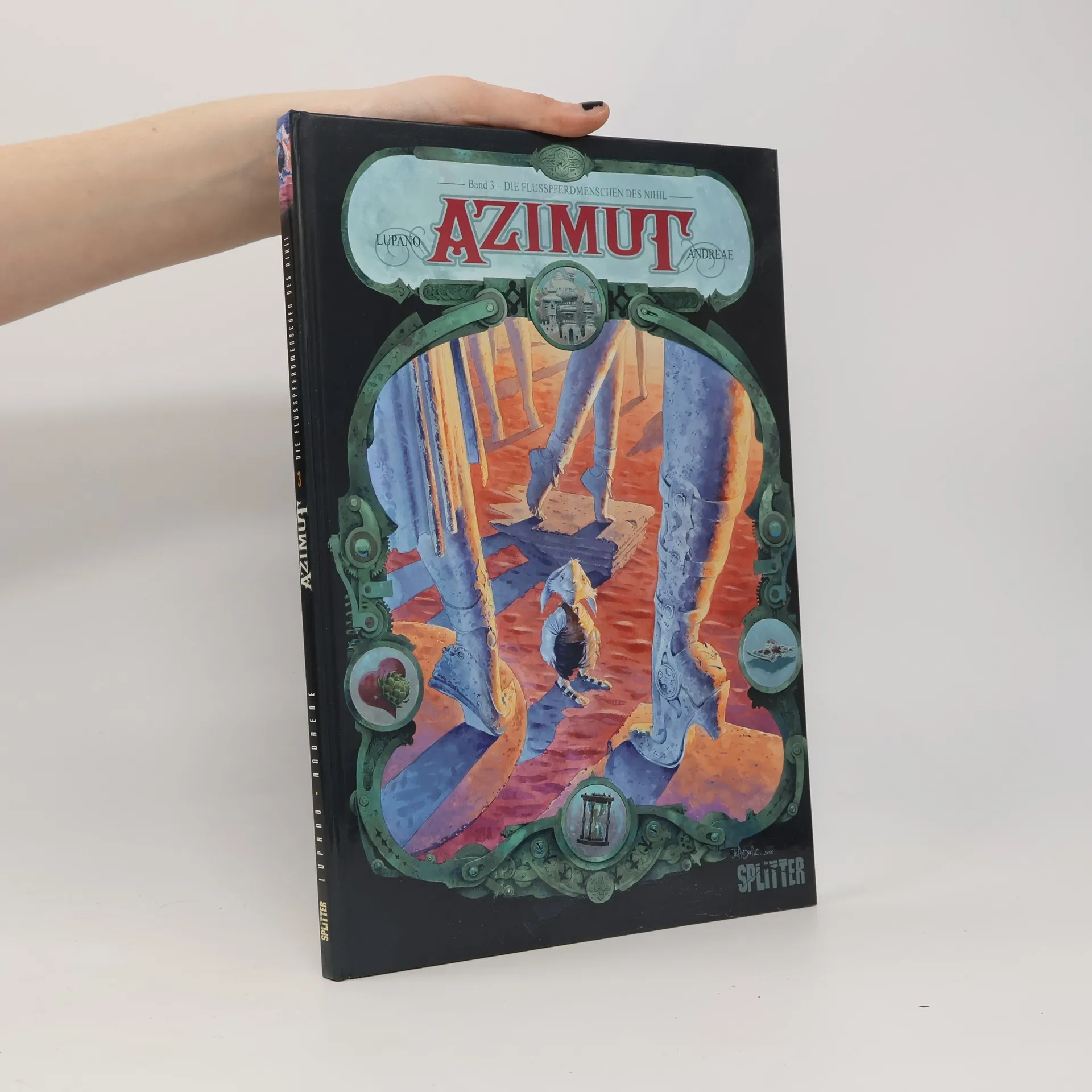 Irgendwo in dem riesigen Sammelsurium von Welten gibt es eine, wo man, mehr als anderswo, tief betroffen ist von der Vorstellung des Alterns und Sterbens. Ihr Name? Azimut.Doch gibt es eine Möglichkeit, dem Tod zu entkommen? Anderswo vielleicht nicht, doch in dieser Welt ist es einem erlaubt, darauf zu hoffen. Zumindest ist dies die Theorie des alten Professors Albrecht Uhrmacher, der in seinem Laborschiff die Launen der Zeit studiert. Indes hat der emeritierte Forscher Quentin von Peru nach 567 Tagen auf See die schmerzhafte Entdeckung gemacht, dass der Nordpol verschwunden ist.Ein Universum voller Fantasie und Einfallsreichtum von dem genialen Autorengespann Lupano/Andreae!