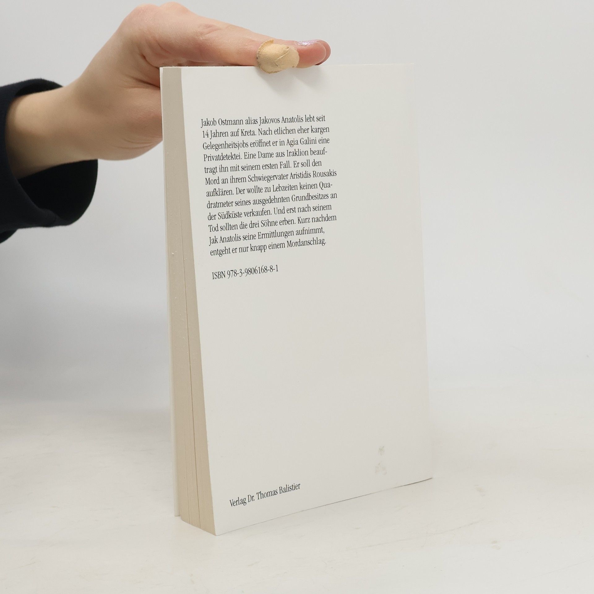 Jakob Ostmann alias Jakovos Anatolis lebt seit 14 Jahren auf Kreta. Nach etlichen eher kargen Gelegenheitsjobs, eröffnet er in Agia Galini eine Privatdetektei. Eine Dame aus Iraklion beauftragt ihn mit seinem ersten Fall. Er soll den Mord an ihrem Schwiegervater Aristidis Rousakis aufklären. Der wollte zu Lebzeiten keinen Quadratmeter seines ausgedehnten Grundbesitzes an der Südküste verkaufen. Und erst nach seinem Tod sollten die drei Söhne erben. Kurz nachdem Jak Anatolis seine Ermittlungen aufnimmt, entgeht er nur knapp einem Mordanschlag.