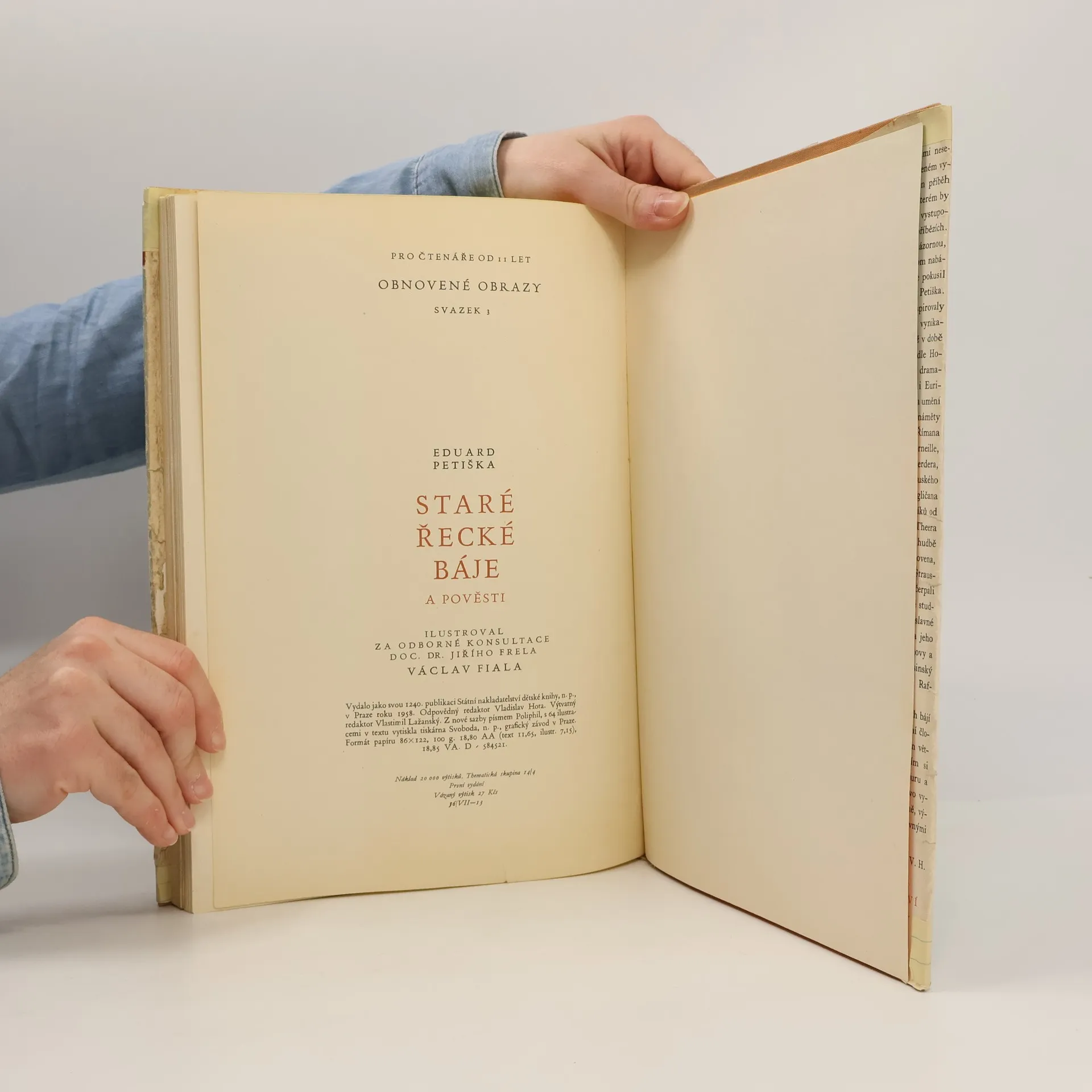 Půvabné Petiškovo převyprávění řecké mytologie je určeno čtenářům od 9 let. Čtenář navštíví rozmanité starověké kraje, seznámí se se záhadnými bytostmi a podivuhodnými zvířaty, pozná moc i slabosti olympských bohů a v úžasu se zastaví před odvážnými skutky a dobrodružstvími bájeslovných hrdinů, promlouvajících přes propast času svou životností i dnes. Kapitoly: Prometheus, Potopa, Faethon, Orfeus, Založení Théb, Pentheus, Midas, Tantalos, Pelops, Niobe, O zlatém rounu, Iason a Medea, Herakles, Perseus, Daidalos a Ikaros, Theseus, Sisyfos, Bellerofontes, Oidipus a Antigone, Filemon a Baucis, Eros a Psyche, Gyges a prsten, Trojská válka, Orestes, Odysseovy cesty, Poslední příběh, který není ani bájí ani pověstí. První vydání. Cena knihy v čase vydání: 27.- Kčs.