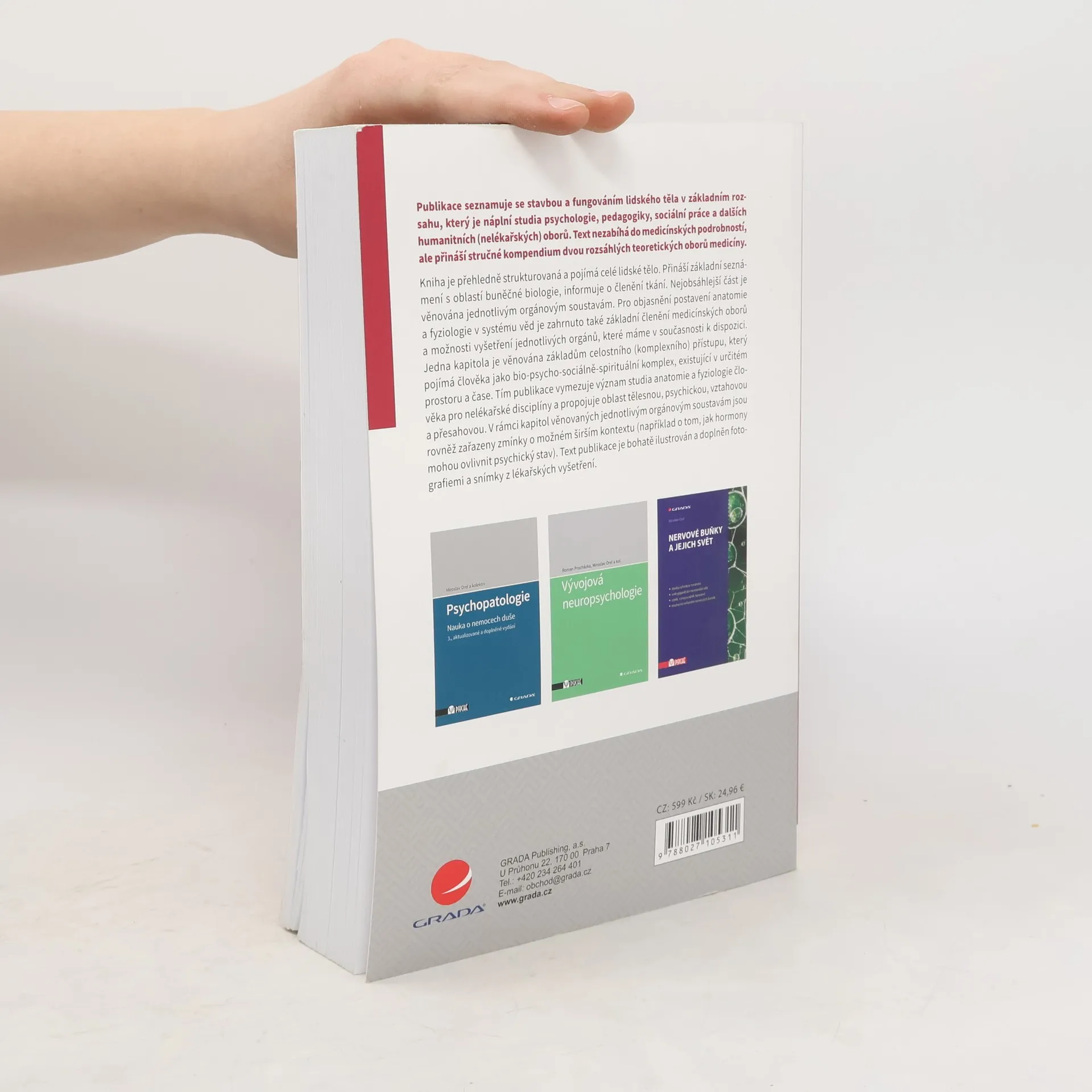 Publikace seznamuje se stavbou a fungováním lidského těla v základním rozsahu, který je náplní studia psychologie, pedagogiky, sociální práce a dalších humanitních (nelékařských) oborů. Text nezabíhá do medicínských podrobností, ale přináší stručné kompendium dvou rozsáhlých teoretických oborů medicíny. Kniha je přehledně strukturovaná a pojímá celé lidské tělo. Přináší základní seznámení s oblastí buněčné biologie, informuje o členění tkání. Nejobsáhlejší část je věnována jednotlivým orgánovým soustavám. Pro objasnění postavení anatomie a fyziologie v systému věd je zahrnuto také základní členění medicínských oborů a možnosti vyšetření jednotlivých orgánů, které máme v současnosti k dispozici. Jedna kapitola je věnována základům celostního (komplexního) přístupu, který pojímá člověka jako bio-psycho-sociálně-spirituální komplex, existující v určitém prostoru a čase.
