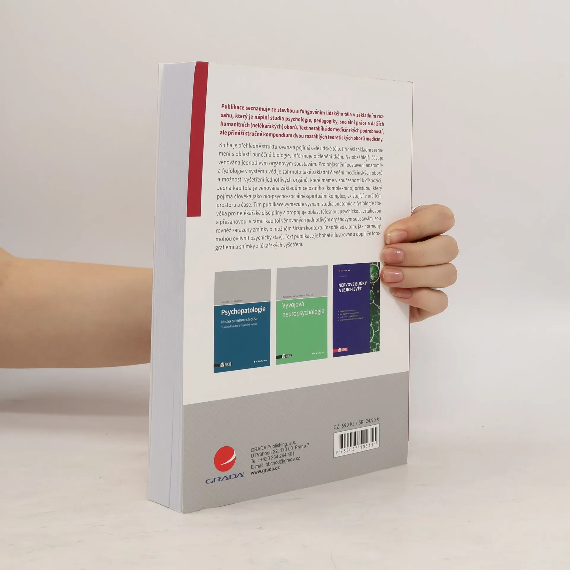 Publikace seznamuje se stavbou a fungováním lidského těla v základním rozsahu, který je náplní studia psychologie, pedagogiky, sociální práce a dalších humanitních (nelékařských) oborů. Text nezabíhá do medicínských podrobností, ale přináší stručné kompendium dvou rozsáhlých teoretických oborů medicíny. Kniha je přehledně strukturovaná a pojímá celé lidské tělo. Přináší základní seznámení s oblastí buněčné biologie, informuje o členění tkání. Nejobsáhlejší část je věnována jednotlivým orgánovým soustavám. Pro objasnění postavení anatomie a fyziologie v systému věd je zahrnuto také základní členění medicínských oborů a možnosti vyšetření jednotlivých orgánů, které máme v současnosti k dispozici. Jedna kapitola je věnována základům celostního (komplexního) přístupu, který pojímá člověka jako bio-psycho-sociálně-spirituální komplex, existující v určitém prostoru a čase.
