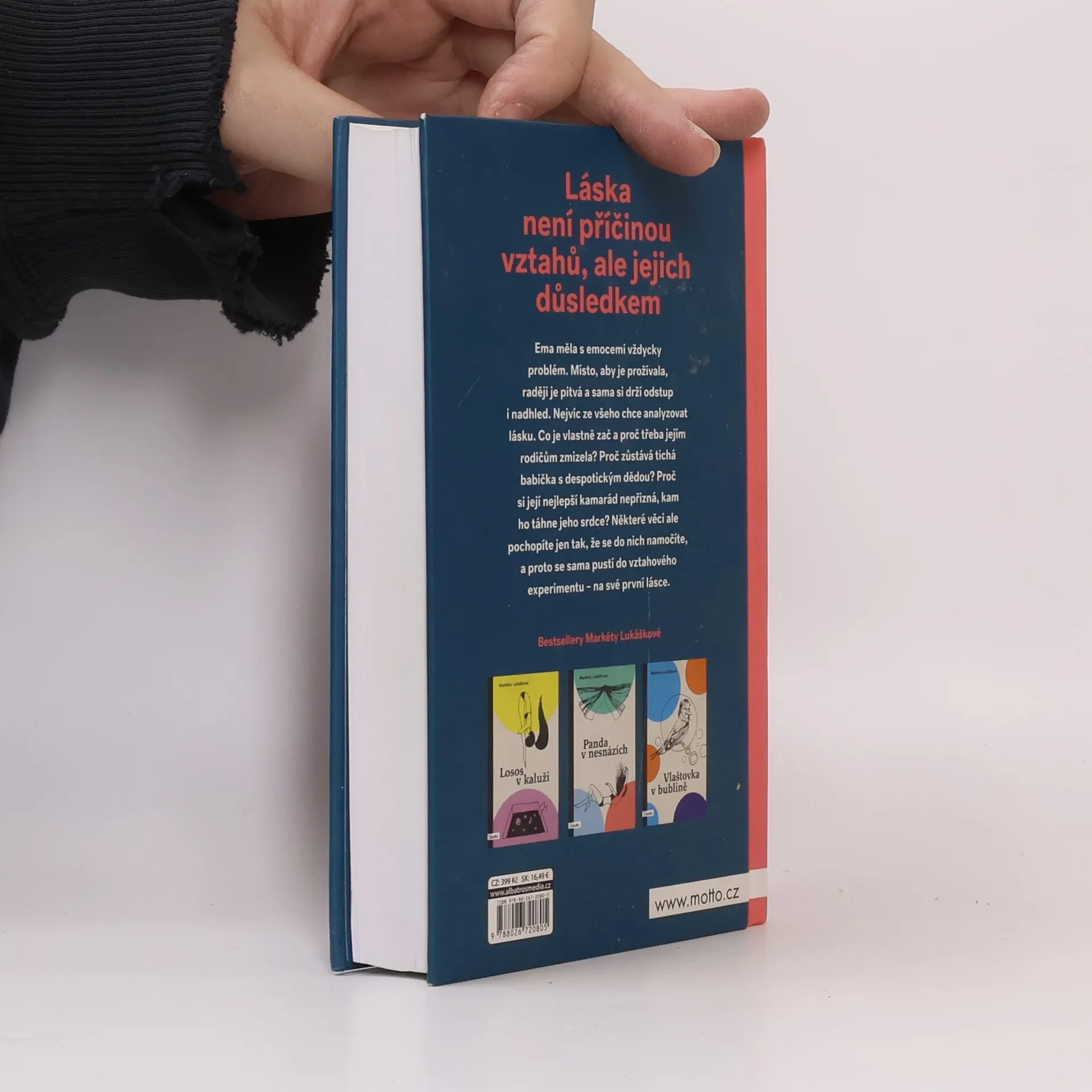 Láska není příčinou vztahů, ale jejich důsledkem Nový samostatný román Markéty Lukáškové. Se svou prvotinou Losos v kaluži objela republiku v rámci divadelního projektu Listování a napsala podle ní scénář, který nyní čeká na filmové zpracování. Po Lososovi následovaly knihy Panda v nesnázích, InTyMně a Vlaštovka v bublině. Skrze své tituly se Markéta snaží šířit osvětu o vnímání psychických problémů. Ema měla s emocemi vždycky problém. Místo, aby je prožívala, raději je pitvá a sama si drží odstup i nadhled. Nejvíc ze všeho chce analyzovat lásku. Co je vlastně zač a proč třeba jejím rodičům zmizela? Proč zůstává tichá babička s despotickým dědou? Proč si její nejlepší kamarád nepřizná, kam ho táhne jeho srdce? Některé věci ale pochopíte jen tak, že se do nich namočíte, a proto se sama pustí do vztahového experimentu – na své první lásce.