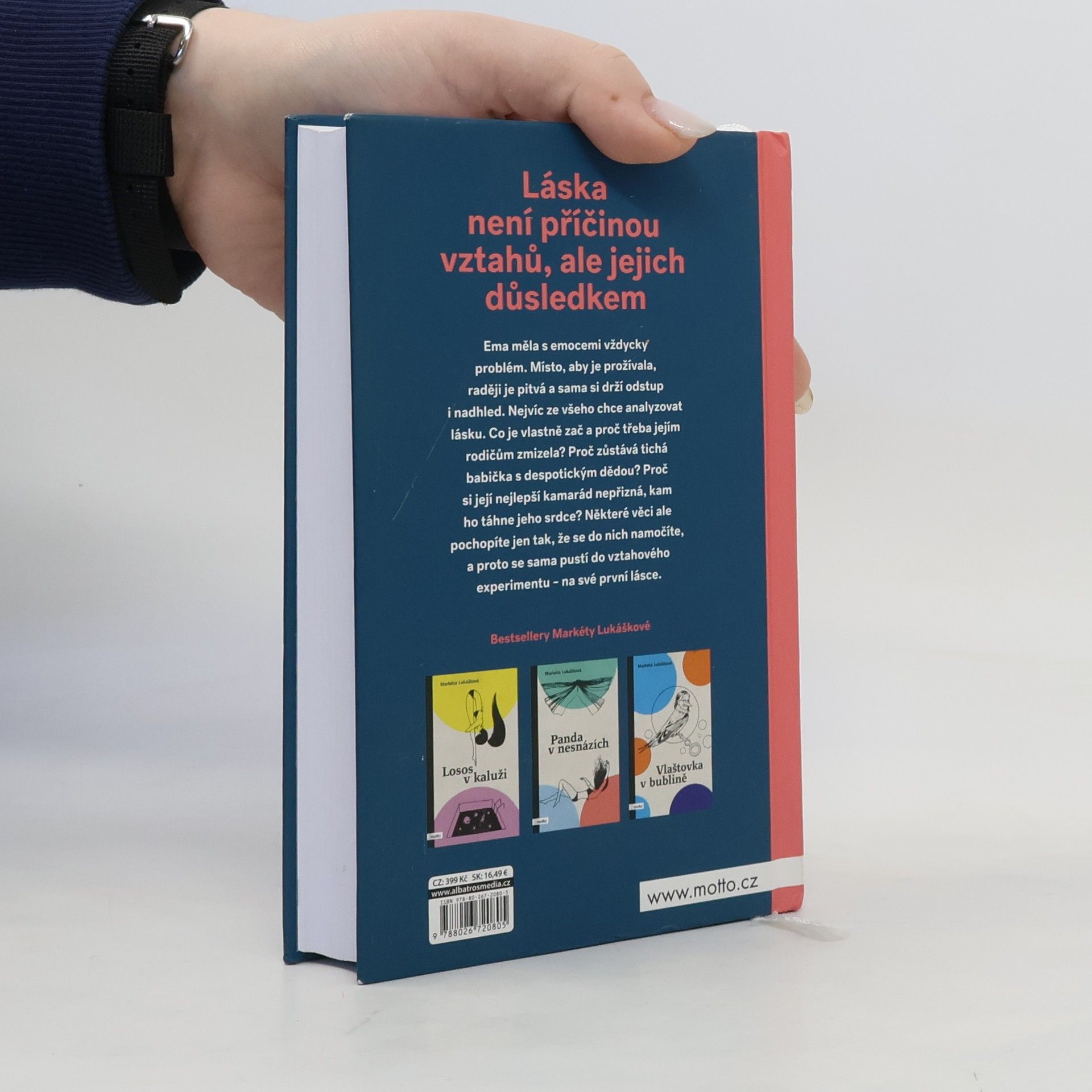 Láska není příčinou vztahů, ale jejich důsledkem Nový samostatný román Markéty Lukáškové. Se svou prvotinou Losos v kaluži objela republiku v rámci divadelního projektu Listování a napsala podle ní scénář, který nyní čeká na filmové zpracování. Po Lososovi následovaly knihy Panda v nesnázích, InTyMně a Vlaštovka v bublině. Skrze své tituly se Markéta snaží šířit osvětu o vnímání psychických problémů. Ema měla s emocemi vždycky problém. Místo, aby je prožívala, raději je pitvá a sama si drží odstup i nadhled. Nejvíc ze všeho chce analyzovat lásku. Co je vlastně zač a proč třeba jejím rodičům zmizela? Proč zůstává tichá babička s despotickým dědou? Proč si její nejlepší kamarád nepřizná, kam ho táhne jeho srdce? Některé věci ale pochopíte jen tak, že se do nich namočíte, a proto se sama pustí do vztahového experimentu – na své první lásce.
