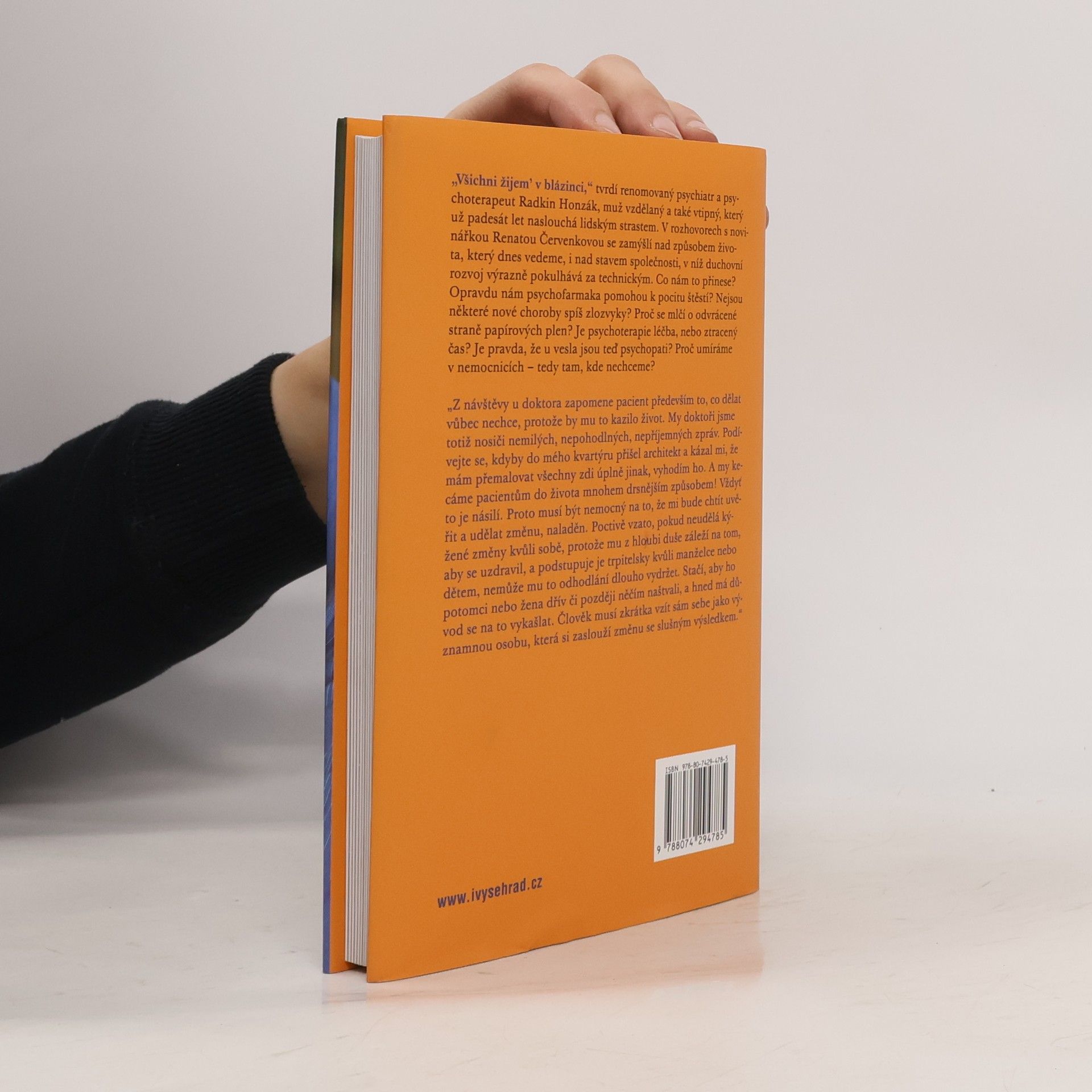 „Všichni žijem’ v blázinci,“ tvrdí renomovaný psychiatr a psychoterapeut Radkin Honzák, který již padesát let naslouchá lidským strastem. V rozhovorech s novinářkou Renatou Červenkovou se zamýšlí nad naším způsobem života a stavem společnosti, v níž duchovní rozvoj zaostává za technickým pokrokem. Jaké to má důsledky? Pomohou nám psychofarmaka k pocitu štěstí? Jsou některé nové choroby spíše zlozvyky? Proč se mlčí o negativních stránkách papírových plen? Je psychoterapie skutečně léčbou, nebo ztraceným časem? A co psychopati u vesla? Proč umíráme v nemocnicích, kde to nechceme? Témata rozhovorů nejsou povzbudivá, ale Radkin Honzák je komentuje s ironií a humorem, přičemž upozorňuje na fenomény dnešní doby, které se „příčí Matce přírodě“ a zajišťují psychiatrům dostatek pacientů i do budoucna. Radkin Honzák (* 1939) po promoci na Fakultě všeobecného lékařství UK v Praze 1962 pracoval jako sekundární lékař v psychiatrické léčebně Kosmonosy a poté jako psychiatr – konzultant v Ústavu pro výzkum výživy a později v IKEM. Dnes je asistentem Ústavu všeobecného lékařství 1. Lékařské fakulty UK, ambulantním psychiatrem IKEM a sekundárním lékařem PL Bohnice.