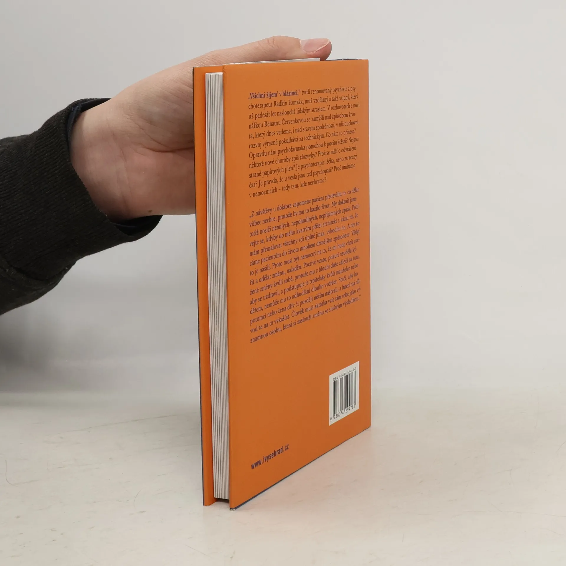 „Všichni žijem’ v blázinci,“ tvrdí renomovaný psychiatr a psychoterapeut Radkin Honzák, který již padesát let naslouchá lidským strastem. V rozhovorech s novinářkou Renatou Červenkovou se zamýšlí nad naším způsobem života a stavem společnosti, v níž duchovní rozvoj zaostává za technickým pokrokem. Jaké to má důsledky? Pomohou nám psychofarmaka k pocitu štěstí? Jsou některé nové choroby spíše zlozvyky? Proč se mlčí o negativních stránkách papírových plen? Je psychoterapie skutečně léčbou, nebo ztraceným časem? A co psychopati u vesla? Proč umíráme v nemocnicích, kde to nechceme? Témata rozhovorů nejsou povzbudivá, ale Radkin Honzák je komentuje s ironií a humorem, přičemž upozorňuje na fenomény dnešní doby, které se „příčí Matce přírodě“ a zajišťují psychiatrům dostatek pacientů i do budoucna. Radkin Honzák (* 1939) po promoci na Fakultě všeobecného lékařství UK v Praze 1962 pracoval jako sekundární lékař v psychiatrické léčebně Kosmonosy a poté jako psychiatr – konzultant v Ústavu pro výzkum výživy a později v IKEM. Dnes je asistentem Ústavu všeobecného lékařství 1. Lékařské fakulty UK, ambulantním psychiatrem IKEM a sekundárním lékařem PL Bohnice.