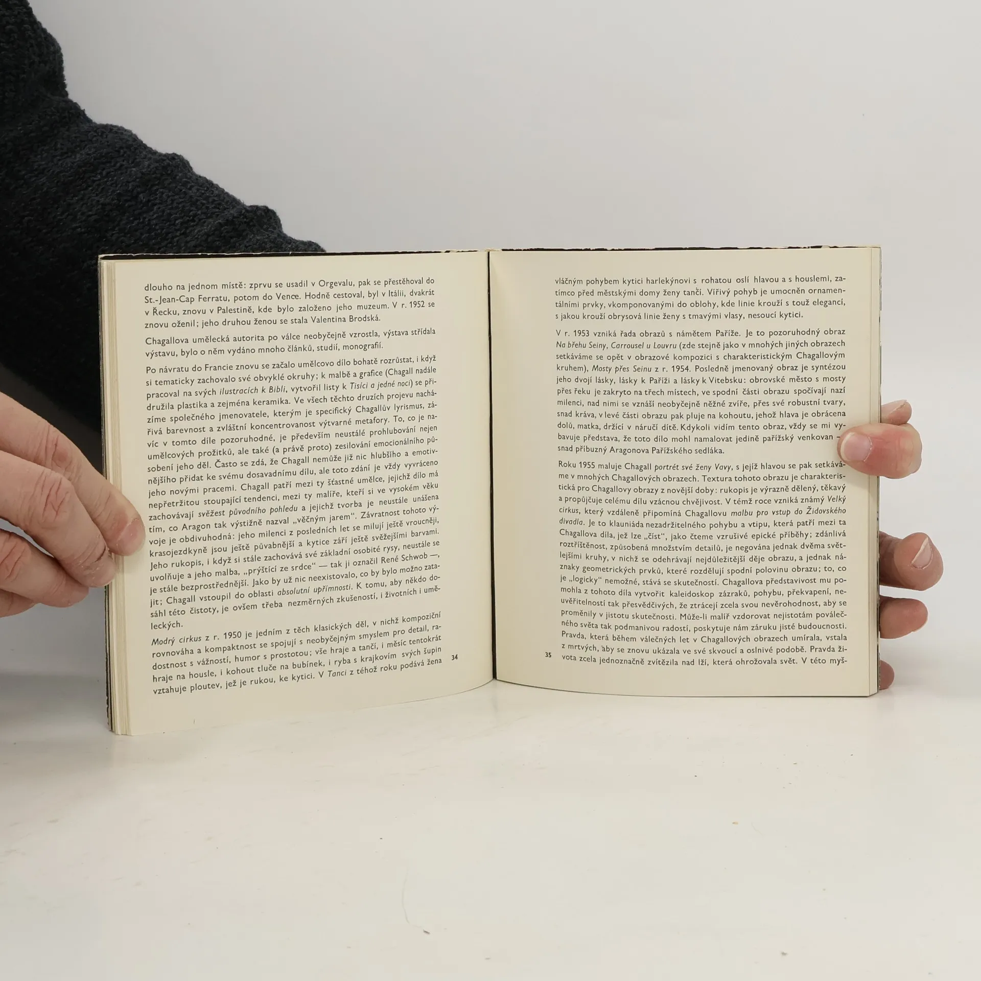 Jak v úvodní studii, tak i v obrazové příloze seznamuje monografie s životem a tvorbou jednoho z nejvýznačnějších zjevů moderního umění 20. stol. Původem z Vitebska, žije od r. 1922 v cizině, hlavně ve Francii, zůstává však svým dílem spjat s prostředím své rodné země. Nezaložil žádnou školu, styl jeho umění je nenapodobitelný. Přesto však jeho dílo cele patří současnosti a je ve své podstatě hluboce humanistické se zvláštním smyslem pro humor a tragiku lidského bytí.
