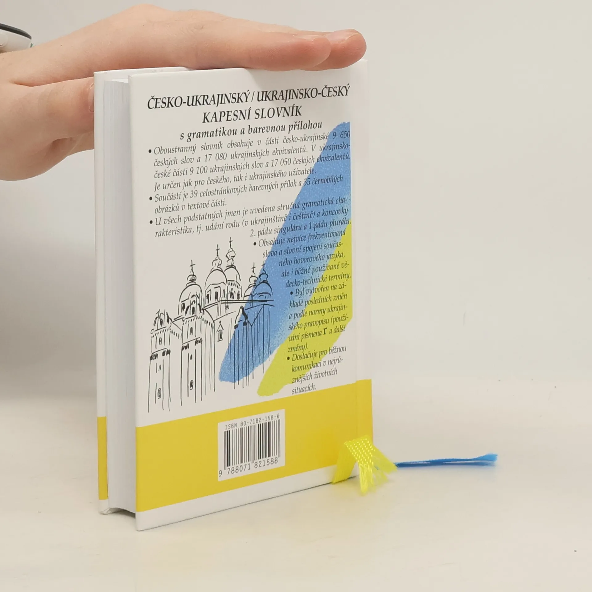 Oboustranný slovník obsahuje v části česko-ukrajinské 9650 českých slov a 17080 ukrajinských ekvivalentů. V ukrajinsko-české části 9100 ukrajinských slov a 17050 českých ekvivalentů. Součástí je 39 celostránkových barevných příloh a 35 černobílých obrázků v textové části. U všech podstatných jmen je uvedena stručná gramatická charakteristika. Obsahuje nejvíce frekventovaná slova a slovní spojení současného hovorového jazyka, ale i běžně používané vědecko-technické termíny. Byl vytvořen na základě posledních změn a podle normy ukrajinského pravopisu.