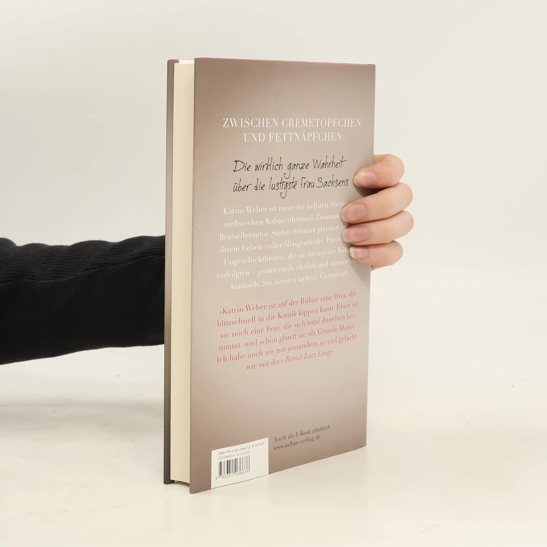 Zwischen Cremetöpfchen und Fettnäpfchen: Die wirklich ganze Wahrheit über die lustigste Frau Sachsens Katrin Weber ist einer der hellsten Sterne am sächsischen Kabaretthimmel. Zusammen mit Bestsellerautor Stefan Schwarz plaudert sie aus ihrem Leben voller Missgeschicke, Pannen und Ungeschicktheiten, die sie bis auf die Bühne verfolgten – größtenteils ehrlich und umwerfend komisch. Die kleine Katrin hatte es schwer. Zu dick, zu langsam, zu dusselig: Stehen, Laufen, Pubertieren, die Liebe. Mit allem war sie später dran als ihre Altersgenossen – bis aus dem hässlichen Entlein im Kindergarten des VEB Narva Glühlampenwerkes Plauen der strahlend schöne Schwan im Scheinwerferlicht der sächsischen Bühnen wurde. Mit Witz, Charme und sächsischer Schnauze glänzt Katrin Weber nach ihrer Gesangsausbildung und zahlreichen Musical- und Fernsehrollen heute überwiegend im Kabarett. „Schwarze Augen – Eine Nacht im Russenpuff“, „Solo“ und „Nicht zu fassen“ heißen ihre umjubelten Programme. Außerdem steht sie als Entertainerin und Sängerin auf der Bühne. In ihrem ersten Buch erzählt Katrin Weber vom Hinfallen und Auffallen in ihrer privaten und künstlerischen Laufbahn. »Katrin Weber ist auf der Bühne eine Diva, die blitzschnell in die Komik kippen kann. Eben ist sie noch eine Frau, die sich total daneben benimmt, und schon glänzt sie als Grande Dame. Ich habe noch nie mit jemandem so viel gelacht wie mit ihr.« Bernd-Lutz Lange