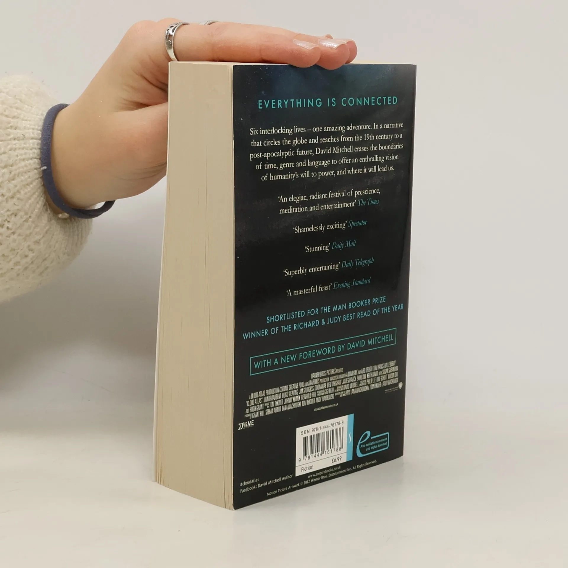By the author of THE THOUSAND AUTUMNS OF JACOB DE ZOET, David Mitchell's bestselling and Booker Prize-shortlisted novel, one of Richard & Judy's 100 Books of the Decade, CLOUD ATLAS has now been adapted for film. The major motion picture, directed by the Wachowskis and Tom Tykwer, stars Tom Hanks, Halle Berry, Susan Sarandon, Jim Sturgess, Ben Whishaw, Jim Broadbent and Hugh Grant. The novel features six characters in interlocking stories, each interrupting the one before it: a reluctant voyager crossing the Pacific in 1850; a disinherited composer blagging a precarious livelihood in between-the-wars Belgium; a high-minded journalist in Governor Reagan's California; a vanity publisher fleeing his gangland creditors; a genetically modified dinery server on death-row; and Zachry, a young Pacific islander witnessing the nightfall of science and civilisation. The narrators of CLOUD ATLAS hear each other's echoes down the corridor of history, and their destinies are changes in ways great and small. Mitchell's other novels are GHOSTWRITTEN, BLACK SWAN GREEN and NUMBER9DREAM, all published by Sceptre. www.sceptrebooks.com Facebook: Sceptre Books Twitter: SceptreBooks