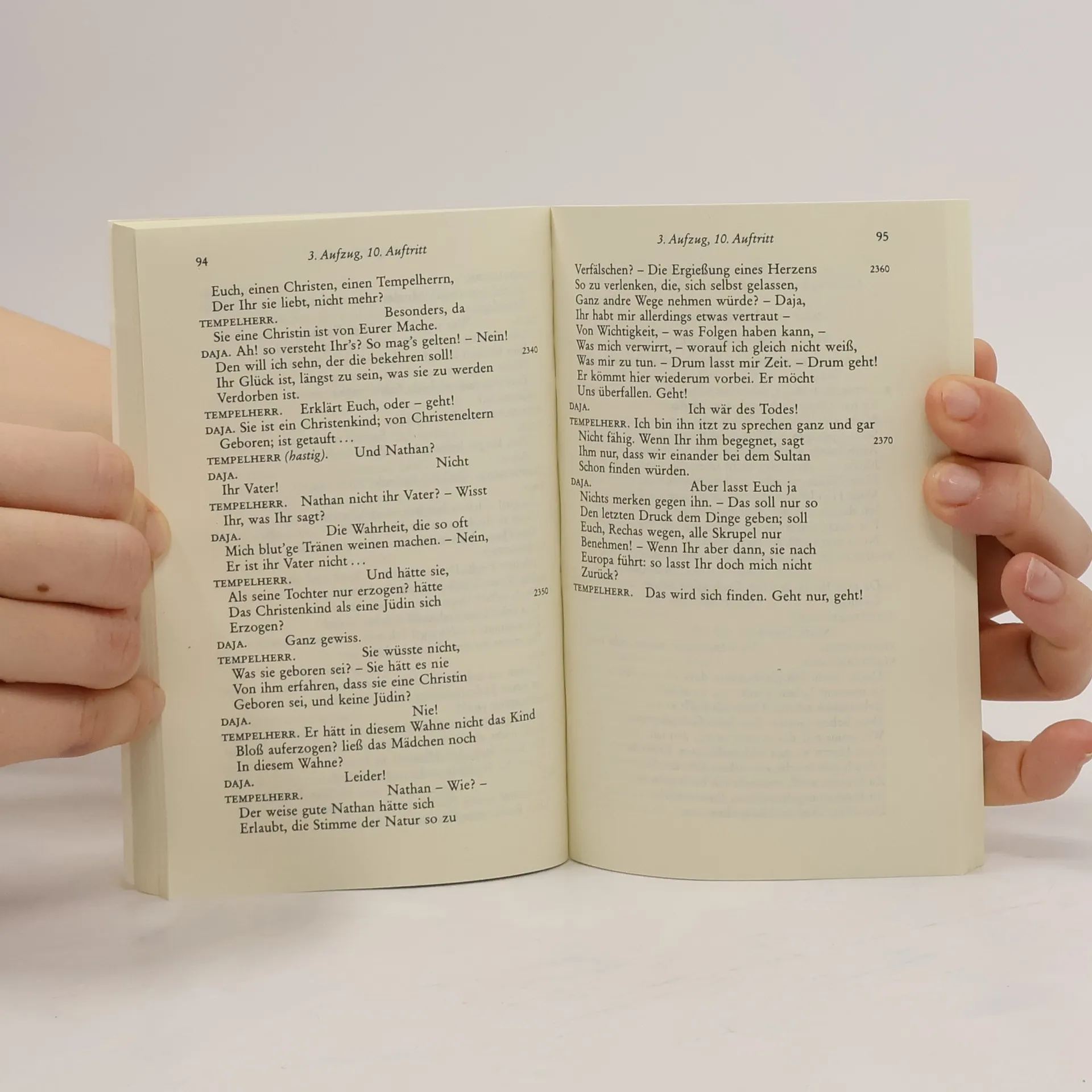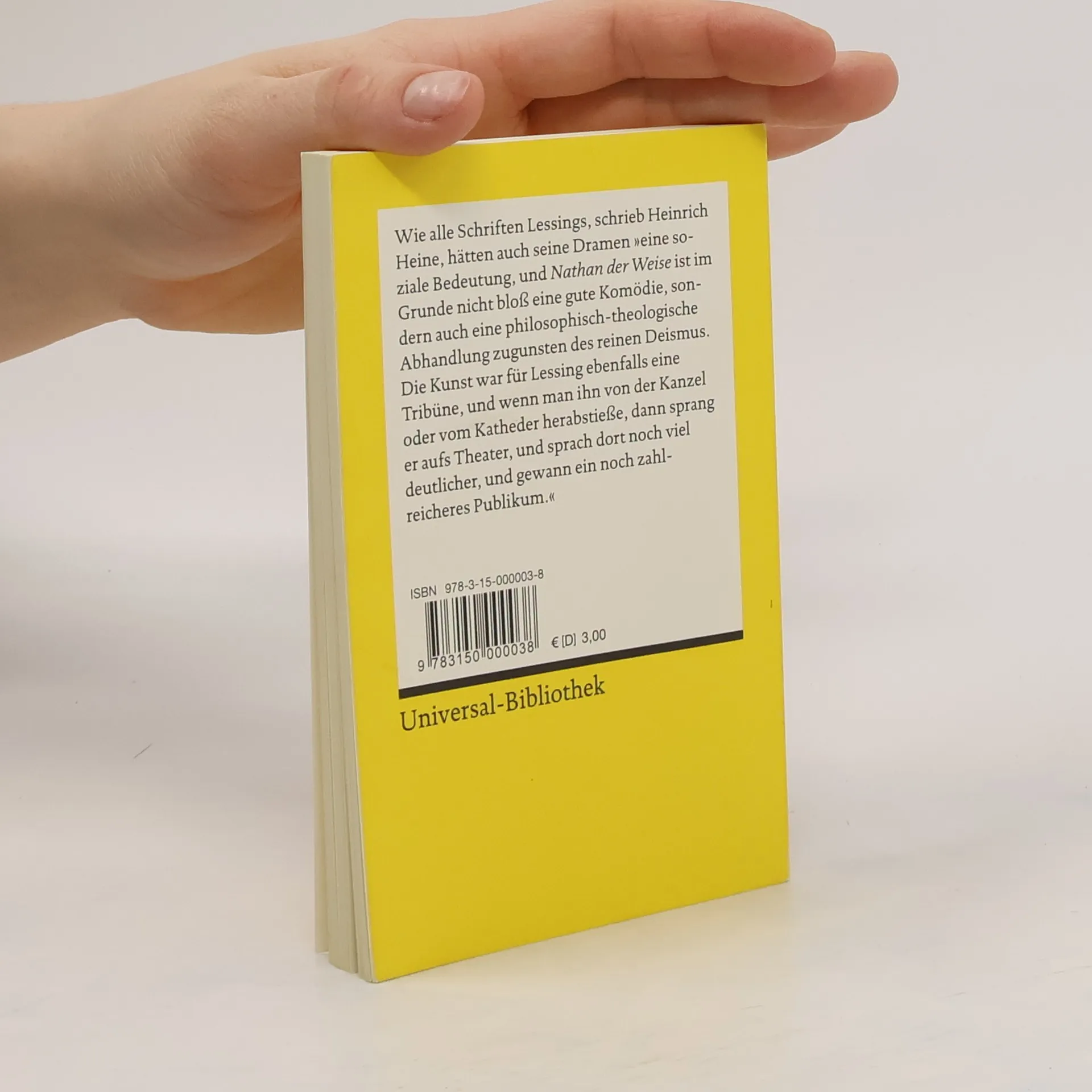 Mit Erläuterungen zu Autor, Text und Wirkung. Die Aussage in Lessings Werk scheint einfach: Der Dichter appelliert an die Toleranz und Menschlichkeit seiner Zeitgenossen im Zeichen der Aufklärung des 18. Jahrhunderts. Durch die Figur des weisen Nathan zeigt er, wie dieser unabhängig von Religion und Herkunft einfach Mensch sein kann. Nathan lebt in Jerusalem zur Zeit der Kreuzzüge und unterrichtet seine angenommene Tochter Recha nicht in Judentum oder Christentum, sondern in Menschlichkeit. Diese Haltung führt zwangsläufig zu Konflikten, da viele unter dem Deckmantel ihrer Religion überzeugt sind, die einzig wahren Werte zu vertreten. Nathan verdeutlicht seine Anschauung in der berühmten Ringparabel: So wie sich die drei identischen Ringe nicht unterscheiden lassen, kann auch unter den Religionen von Juden, Christen und Moslems nicht entschieden werden, welche den echten Glauben darstellt. Am Ende überzeugt Nathan die Zweifler in nur zwei Stunden auf der Bühne. Toleranz und Menschlichkeit sind die höchsten Güter der Zivilisation. Auch heute, im späten 20. Jahrhundert, sind Intoleranz und Ignoranz weit verbreitet, und wir benötigen weiterhin eine Erklärung der wahren Werte unserer Gesellschaft. Nathan kann uns als Lehrmeister dienen, und seine Botschaft bleibt einfach und relevant.