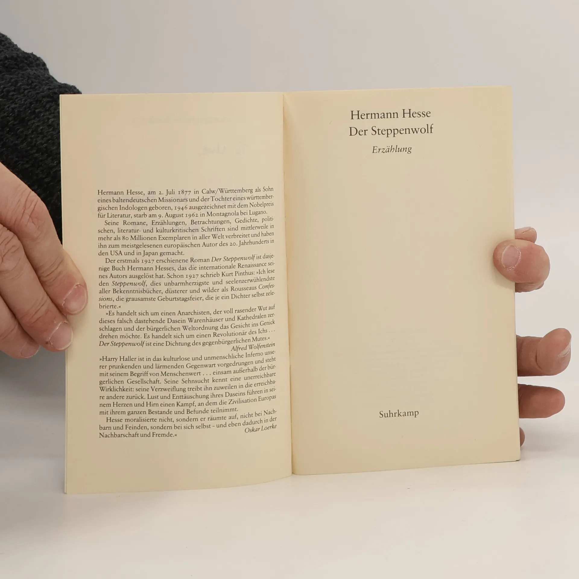 »Harry Haller ist in das kulturlose und unmenschliche Inferno unserer prunkenden und lärmenden Gegenwart vorgedrungen und steht mit seinem Begriff von Menschenwert... einsam außerhalb der bürgerlichen Gesellschaft. Seine Sehnsucht kennt eine unerreichbare Wirklichkeit: seine Verzweiflung treibt ihn zuweilen in die erreichbare andere zurück. Lust und Enttäuschung ihres Daseins führen in seinem Herzen und Hirn einen Kampf, an dem die Zivilisation Europas mit ihrem ganzen Bestände und Befunde teilnimmt.« Oskar Loerke