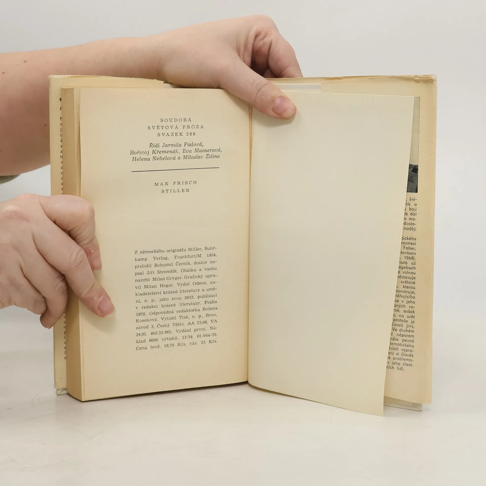 První ze tří románů švýcarského žurnalisty, dramatika a spisovatele spojených společnou problematikou ve volnou trilogii (Stiller, Homo Faber, Mé jméno budiž Gantenbein). Expozici tohoto románu o člověku moderní doby, marně hledajícím ve společnosti sebeuplatnění, tvoří příběh zadrženého muže na švýcarských hranicích, který je vyšetřován pro podezření, že není tím člověkem, za kterého se vydává. Soudně prováděné vyšetřování a nakonec obžaloba odhaluje člověka, jenž pochopil svou životní bezúspěšnost, odjel do ciziny, změnil jméno a v honbě za specifickým sebeuplatněním, v podstatě v honbě za svobodou pro svobodu, promarnil svůj život. Doslov napsal Jiří Stromšík.