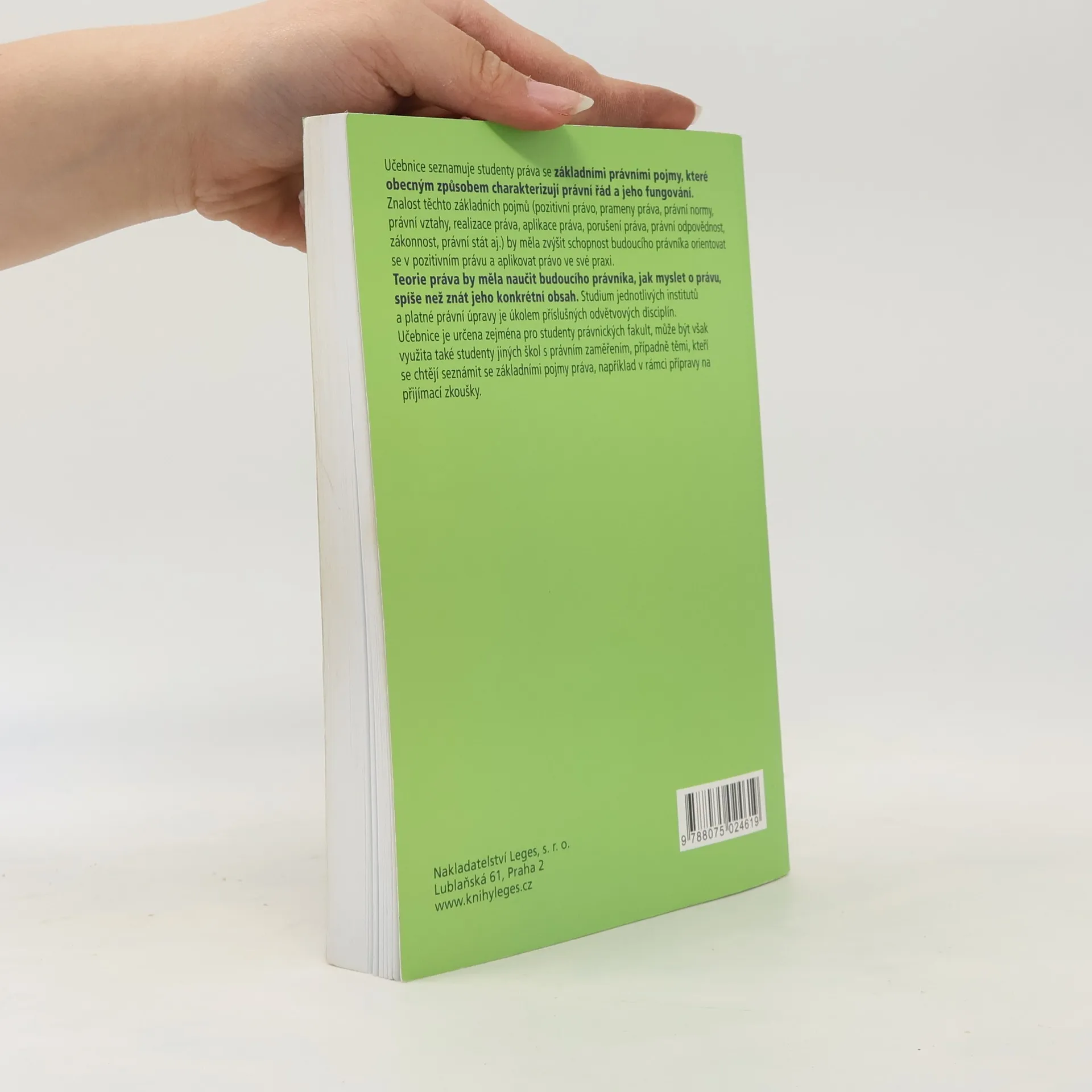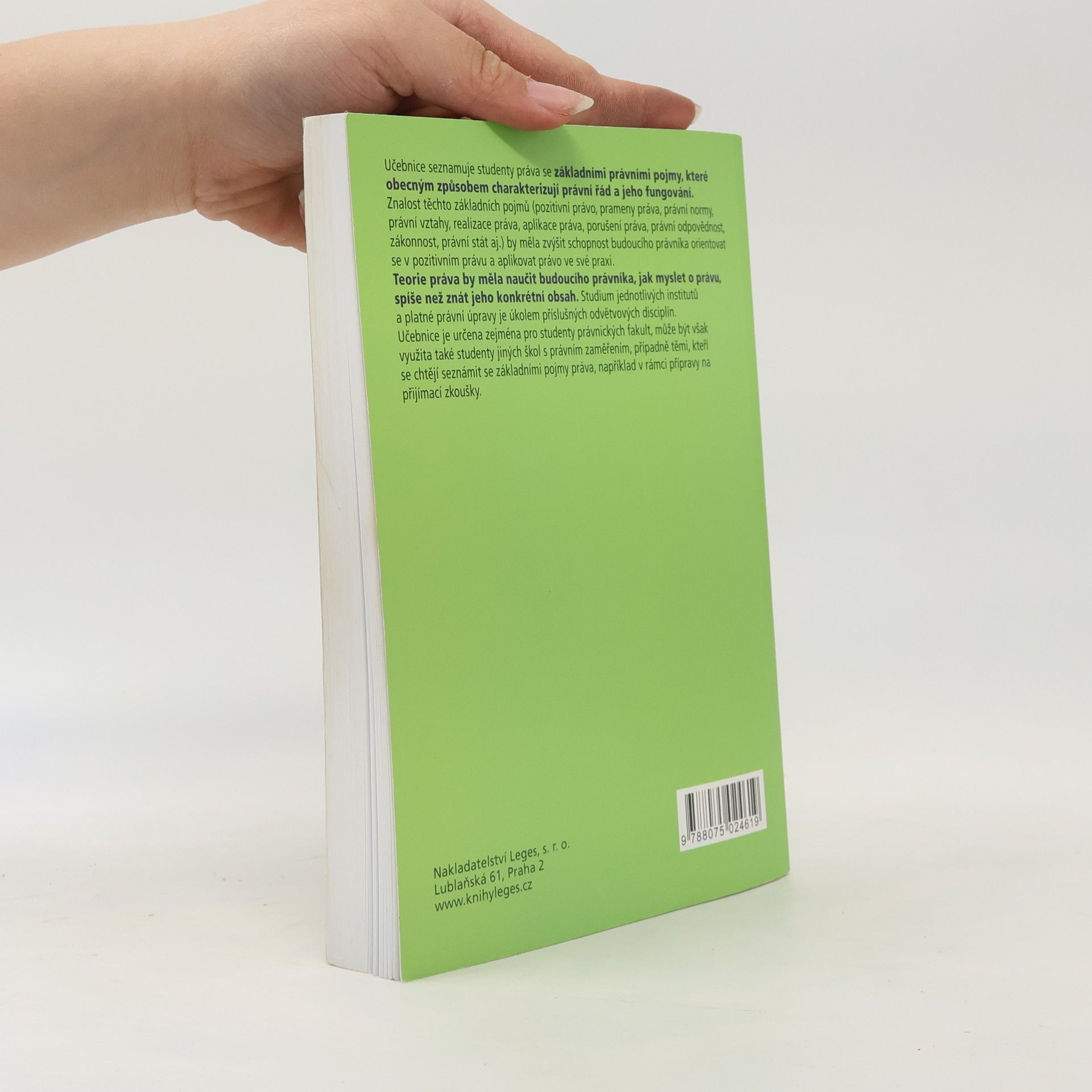 Učebnice seznamuje studenty práva se základními právními pojmy, které obecným způsobem charakterizují právní řád a jeho fungování. Znalost těchto základních pojmů (pozitivní právo, prameny práva, právní normy, právní vztahy, realizace práva, aplikace práva, porušení práva, právní odpovědnost, zákonnost, právní stát aj.) by měla zvýšit schopnost budoucího právníka orientovat se v pozitivním právu a aplikovat právo ve své praxi. Teorie práva by měla naučit budoucího právníka, jak myslet o právu, spíše než znát jeho konkrétní obsah. Studium jednotlivých institutů a platné právní úpravy je úkolem příslušných odvětvových disciplín. Učebnice je určena zejména pro studenty právnických fakult, může být však využita také studenty jiných škol s právním zaměřením, případně těmi, kteří se chtějí seznámit se základními pojmy práva, například v rámci přípravy na přijímací zkoušky.