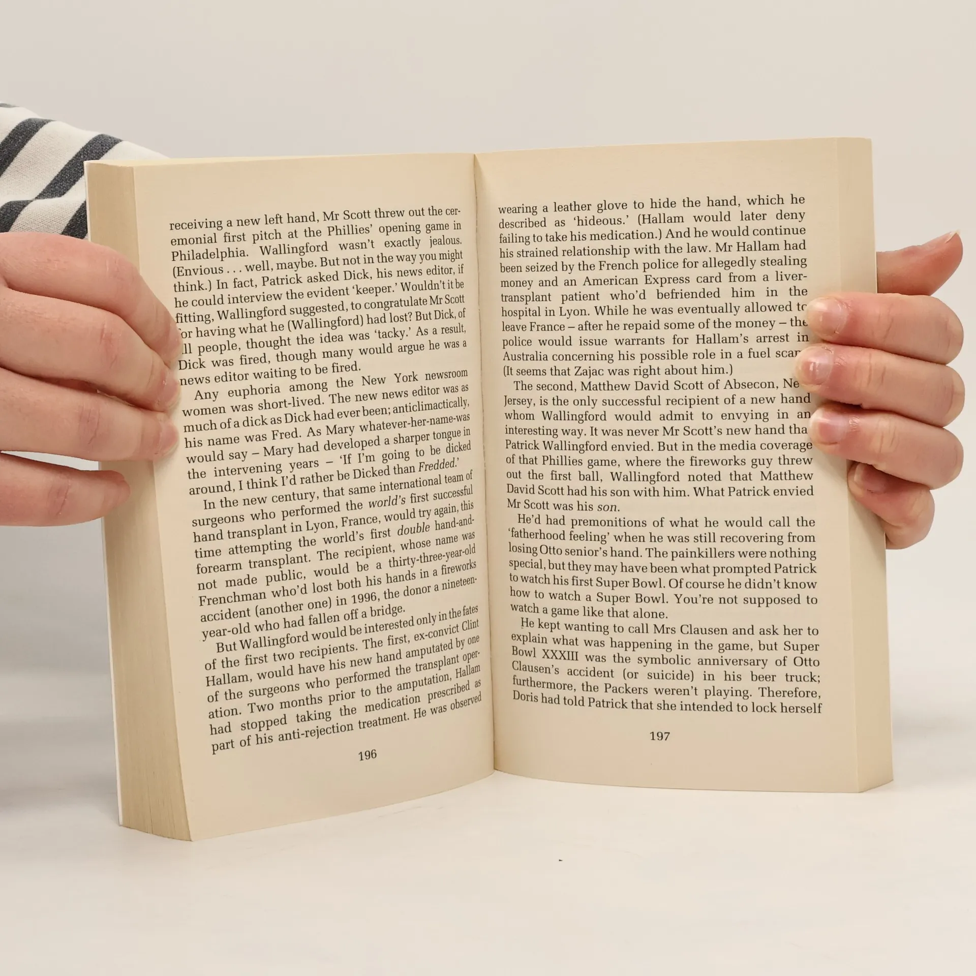'Imagine a young man on his way to a less-than-thirty-second event - the loss of his left hand, long before he reached middle age.' While reporting a story from India, a New York television journalist has his left hand eaten by a lion; millions of TV viewers witness the accident. In Boston, a renowned hand surgeon awaits the opportunity to perform the nation's first hand transplant. A married woman in Wisconsin wants to give the one-handed reporter her husband's left hand, that is, after her husband dies. But the husband is alive, relatively young, and healthy ...