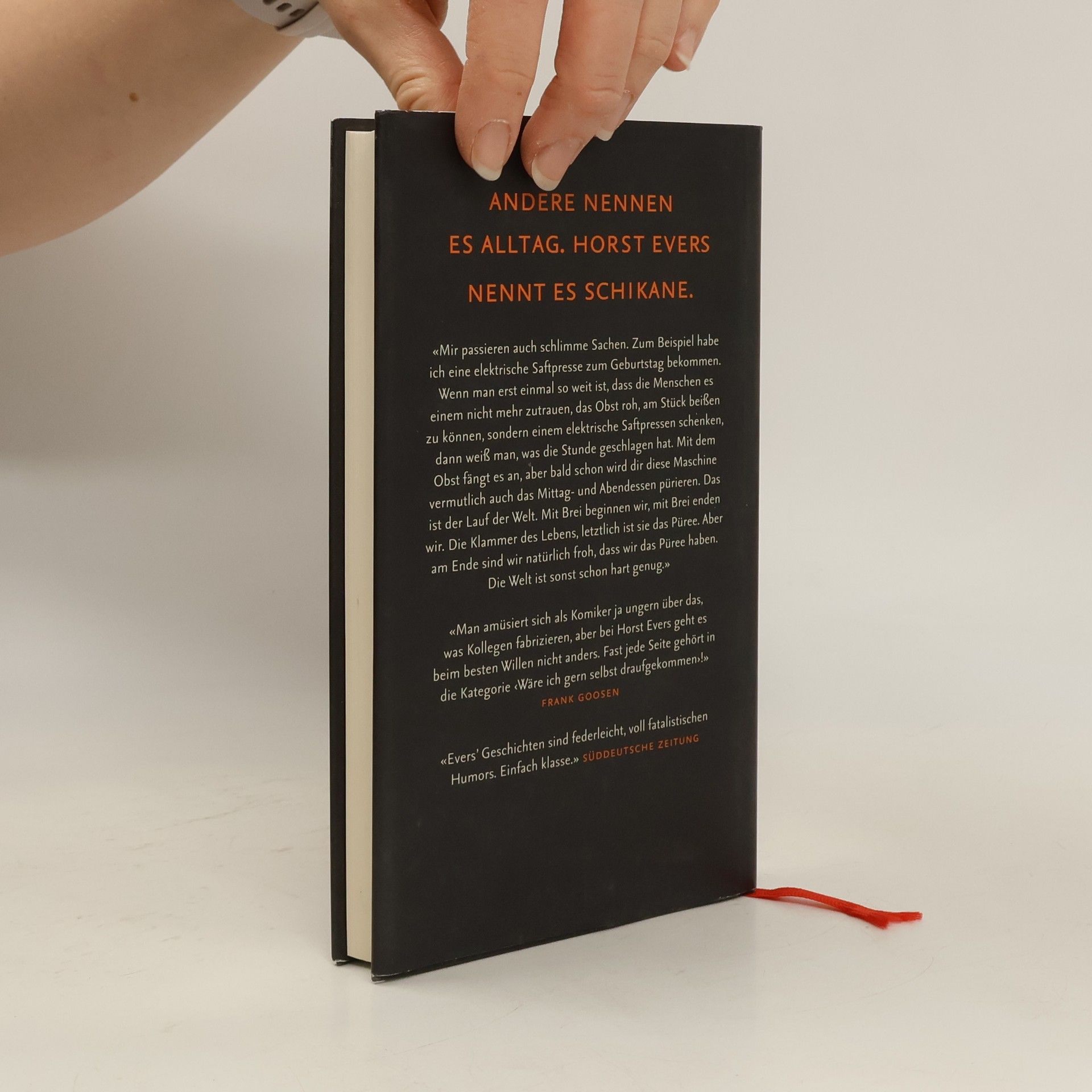 Andere nennen es Alltag. Horst Evers nennt es Schikane.«Mir passieren auch schlimme Sachen. Zum Beispiel habe ich eine elektrische Saftpresse zum Geburtstag bekommen. Wenn man erst einmal so weit ist, dass die Menschen es einem nicht mehr zutrauen, das Obst roh, am Stück beißen zu können, sondern einem elektrische Saftpressen schenken, dann weiß man, was die Stunde geschlagen hat. Mit dem Obst fängt es an, aber bald schon wird dir diese Maschine vermutlich auch das Mittag- und Abendessen pürieren. Das ist der Lauf der Welt. Mit Brei beginnen wir, mit Brei enden wir. Die Klammer des Lebens, letztlich ist sie das Püree. Aber am Ende sind wir natürlich froh, dass wir das Püree haben. Die Welt ist sonst schon hart genug.»«Man amüsiert sich als Komiker ja ungern über das, was Kollegen fabrizieren, aber bei Horst Evers geht es beim besten Willen nicht anders. Fast jede Seite gehört in die Kategorie ‹Wäre ich gern selbst draufgekommen›!» Frank Goosen«Evers’ Geschichten sind federleicht, voll fatalistischen Humors. Einfach klasse.» Süddeutsche Zeitung