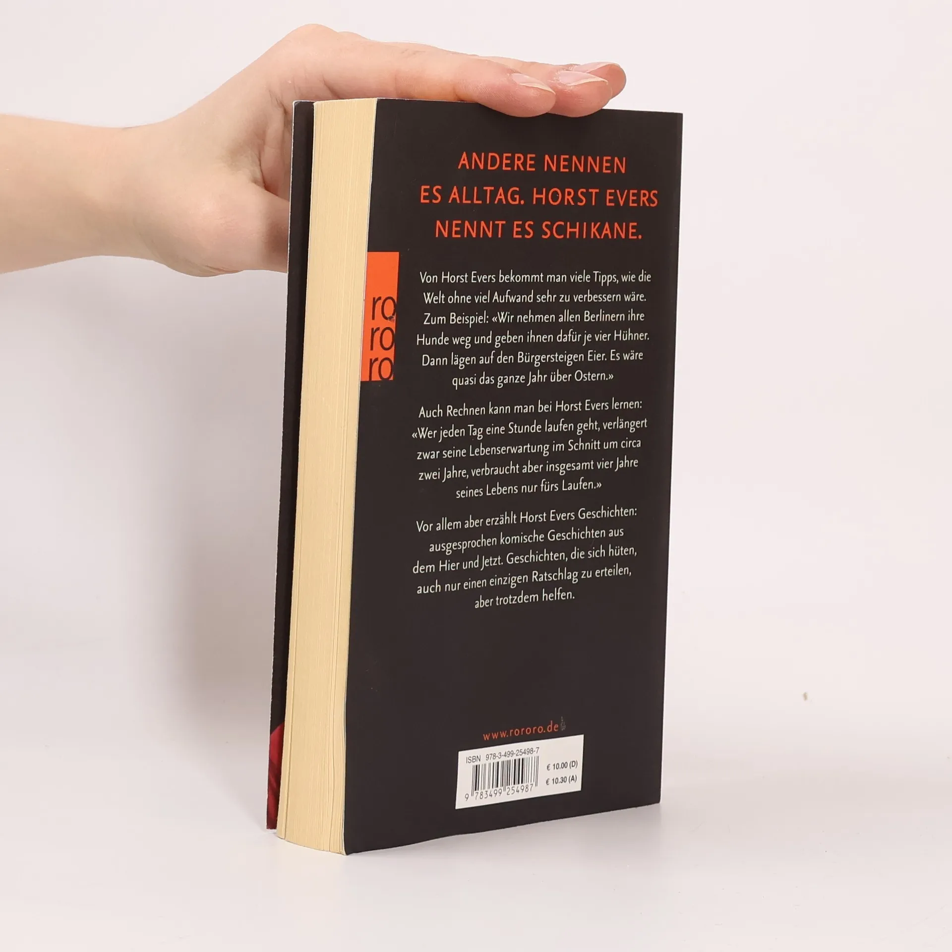 Andere nennen es Alltag. Horst Evers nennt es Schikane. Von Horst Evers bekommt man viele Tipps, wie die Welt ohne viel Aufwand sehr zu verbessern wäre. Zum Beispiel: «Wir nehmen allen Berlinern ihre Hunde weg und geben ihnen dafür je vier Hühner. Dann lägen auf den Bürgersteigen Eier. Es wäre quasi das ganze Jahr über Ostern.» Auch Rechnen kann man bei Horst Evers lernen: «Wer jeden Tag eine Stunde laufen geht, verlängert zwar seine Lebenserwartung im Schnitt um circa zwei Jahre, verbraucht aber insgesamt vier Jahre seines Lebens nur fürs Laufen.» Vor allem aber erzählt Horst Evers Geschichten: ausgesprochen komische Geschichten aus dem Hier und Jetzt. Geschichten, die sich hüten, auch nur einen einzigen Ratschlag zu erteilen, aber trotzdem helfen.
