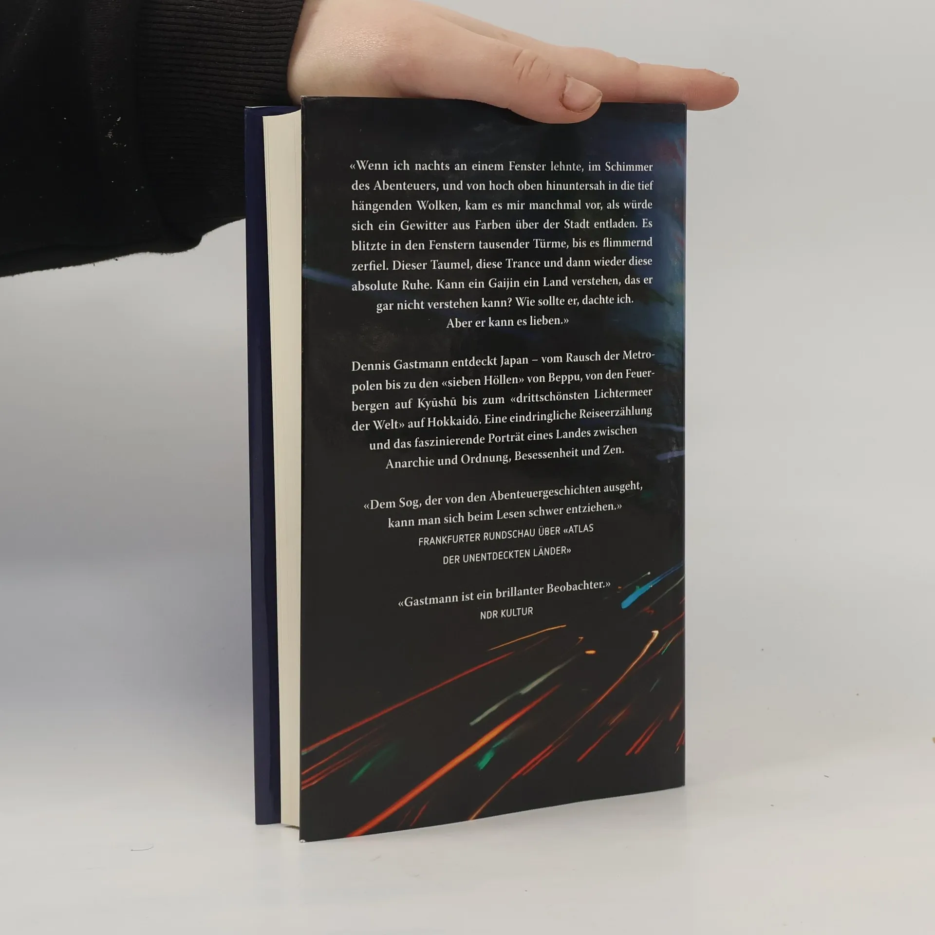 Rätsel, Regeln und Rituale – Dennis Gastmann macht sich auf, Japan zu erkunden, ein Land, das noch immer unvergleichlich fremd und geheimnisvoll wirkt. Dabei ist er nicht allein: Natsumi, seine Frau, die aus einer Samurai-Familie stammt, begleitet ihn. Die beiden bereisen den gesamten Inselstaat, von den grünen Gipfeln auf Hokkaidō bis zu den Vulkanen auf Kyūshū, sie pilgern in die Tempelstadt Nikkō und verlieren sich im Lichterrausch der Metropolen. Japan, wie es sich der Westen vorstellt, erlebt Gastmann im Neongewitter eines Tokyoter Roboterrestaurants. In einer Bar in Kagoshima wird er selbst als Fremder bestaunt: „Wir sitzen hier seit dreißig Jahren“, erzählen ihm die Trinkenden, „und noch nie hat sich ein Gaijin hereingetraut.“ Schließlich, in den „sieben Höllen“ von Beppu, das für seine heißen Quellen bekannt ist, sucht er nach Ruhe und begegnet einem ergrauten Herrn im Yukata, der plötzlich rauchend vor ihm sitzt. Ist er der Geist eines Samurai? Dennis Gastmanns Reiseerzählung ist das faszinierende Porträt eines Landes zwischen Anarchie und Ordnung, Besessenheit und Zen – und ein sehr persönliches Abenteuer: Kann ein „Gaijin“, ein Fremder, eine Kultur verstehen, die ein Fremder gar nicht verstehen kann?