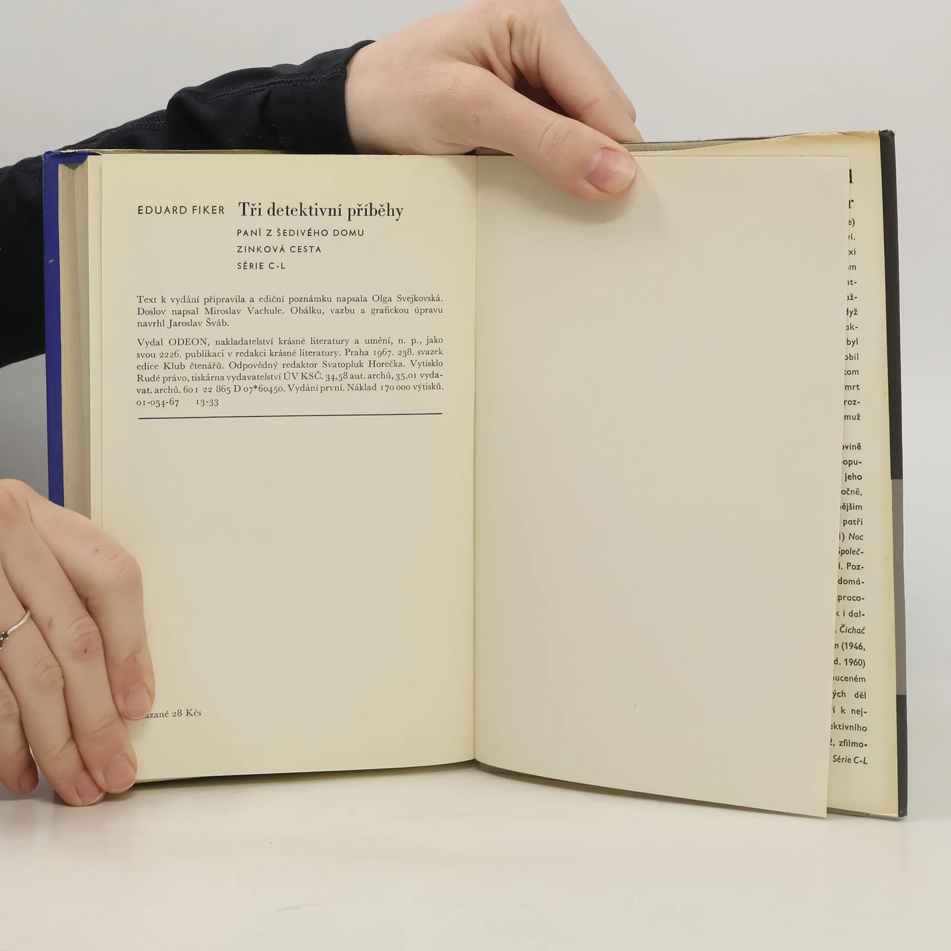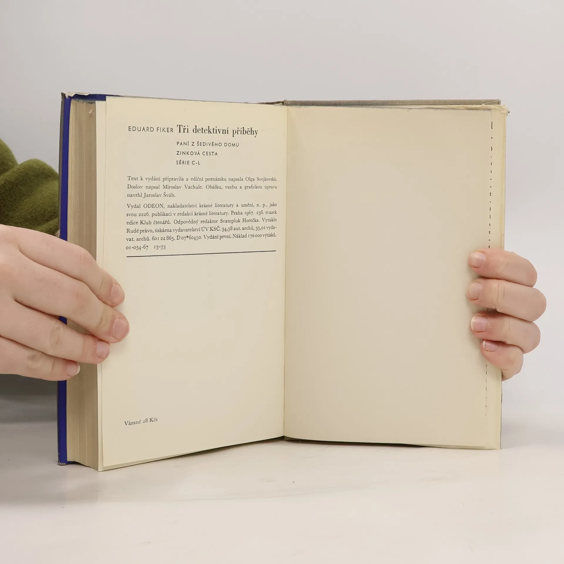 obsahuje 3 detektivní romány Paní z Šedivého domu (Tři čtvrti na jedenáct). Zinková cesta. Série C-L. Vyšlo v Klubu čtenářů - 238. Text k vydání připravila a ediční poznámku napsala Olga Svejkovská. Doslov „Několik slov o Eduardu Fikerovi“ napsal Miroslav Vachule. První vydání.