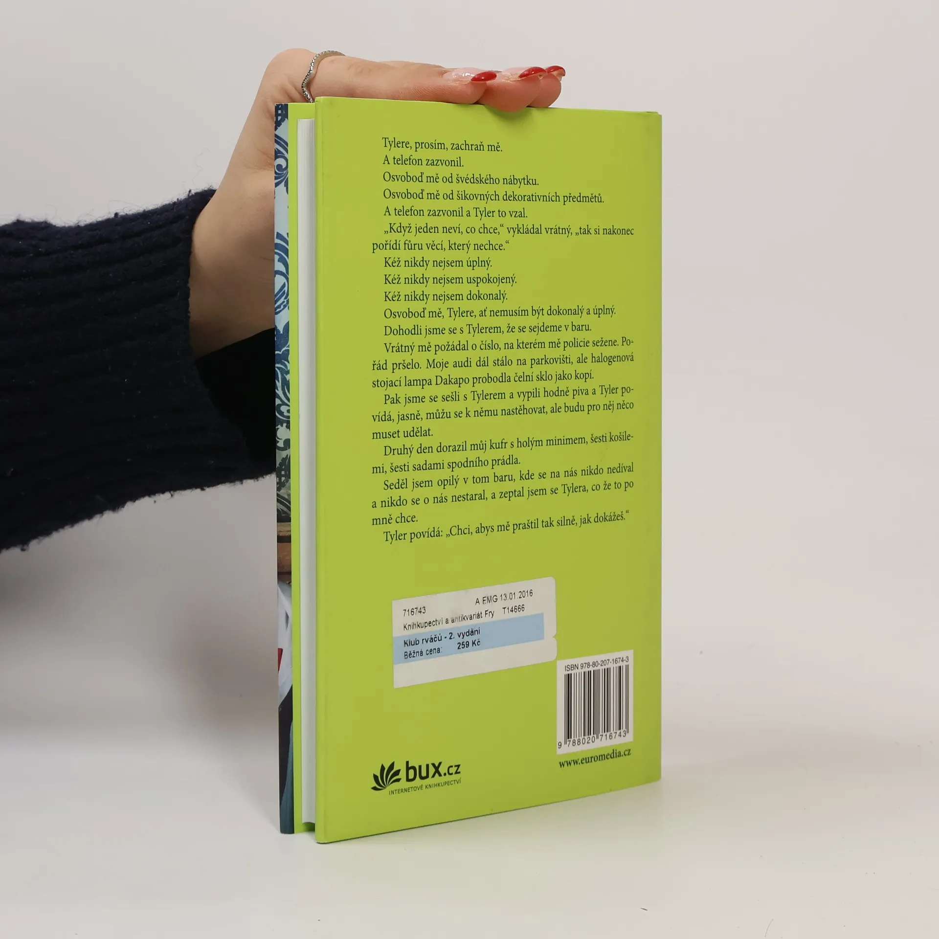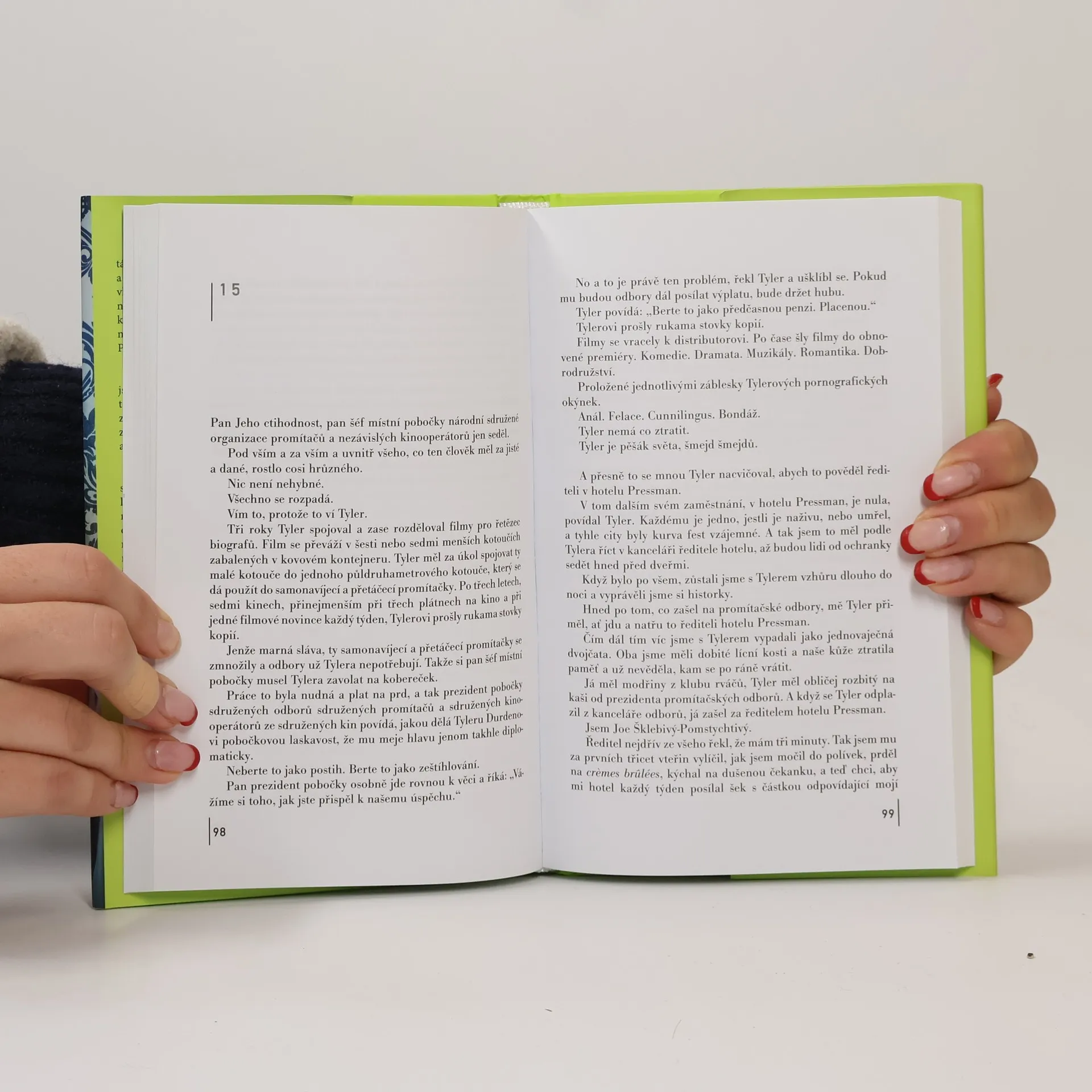 Když nemůžete půl roku usnout, okolní svět vám začne připadat jako nekonečný sen. Takových lidí moc není, ale mladý úspěšný úředník, který si říká Jack, je jedním z nich. Jeho život se změní, když potká Tylera Durdena – spolu založí první klub rváčů, místo, kde si může každý „vyměnit názor“ s druhým. Nejznámější román Chucka Palahniuka, zfilmovaný r. 1999 Davidem Fincherem, vychází v novém překladu.