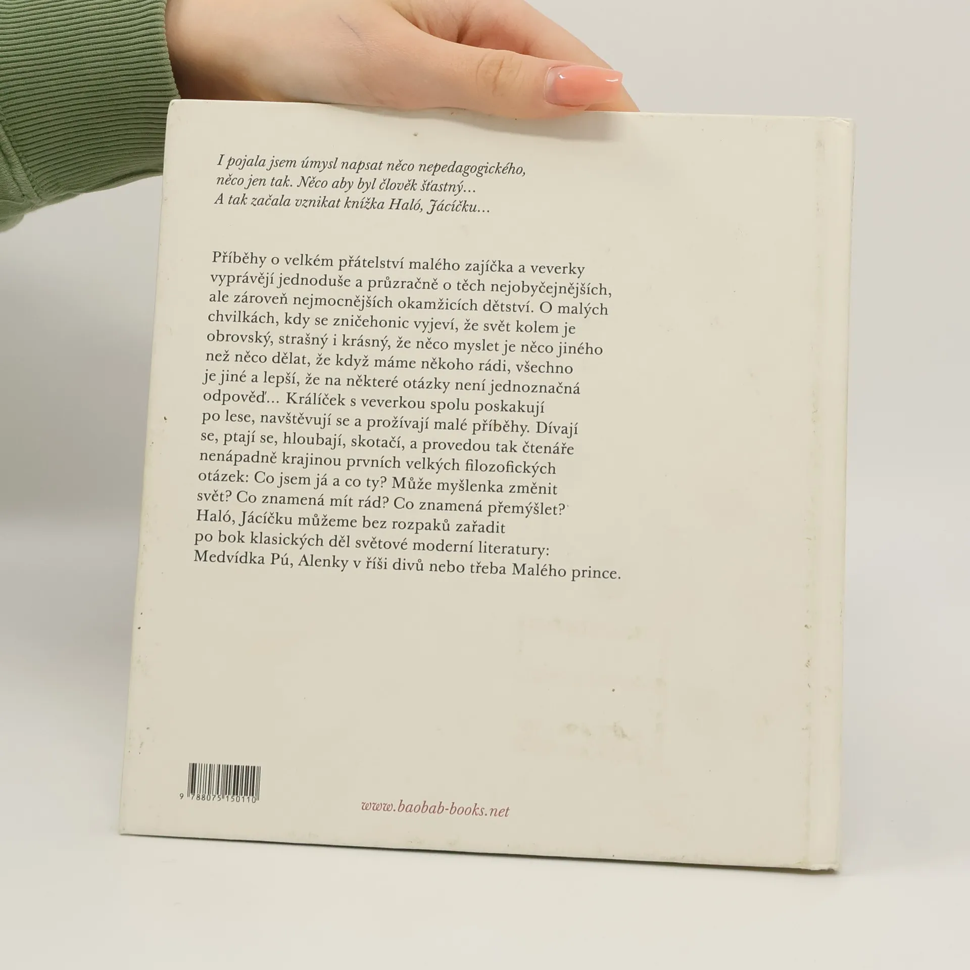 Příběhy o velkém přátelství malého zajíčka a veverky vyprávějí jednoduše a průzračně o těch nejobyčejnějších, ale zároveň nejmocnějších okamžicích dětství. O malých chvilkách, kdy se zničehonic vyjeví, že svět kolem je obrovský, strašný i krásný, že něco myslet je něco jiného než něco dělat, že když máme někoho rádi, všechno je jiné a lepší, že na některé otázky není jednoznačná odpověď.