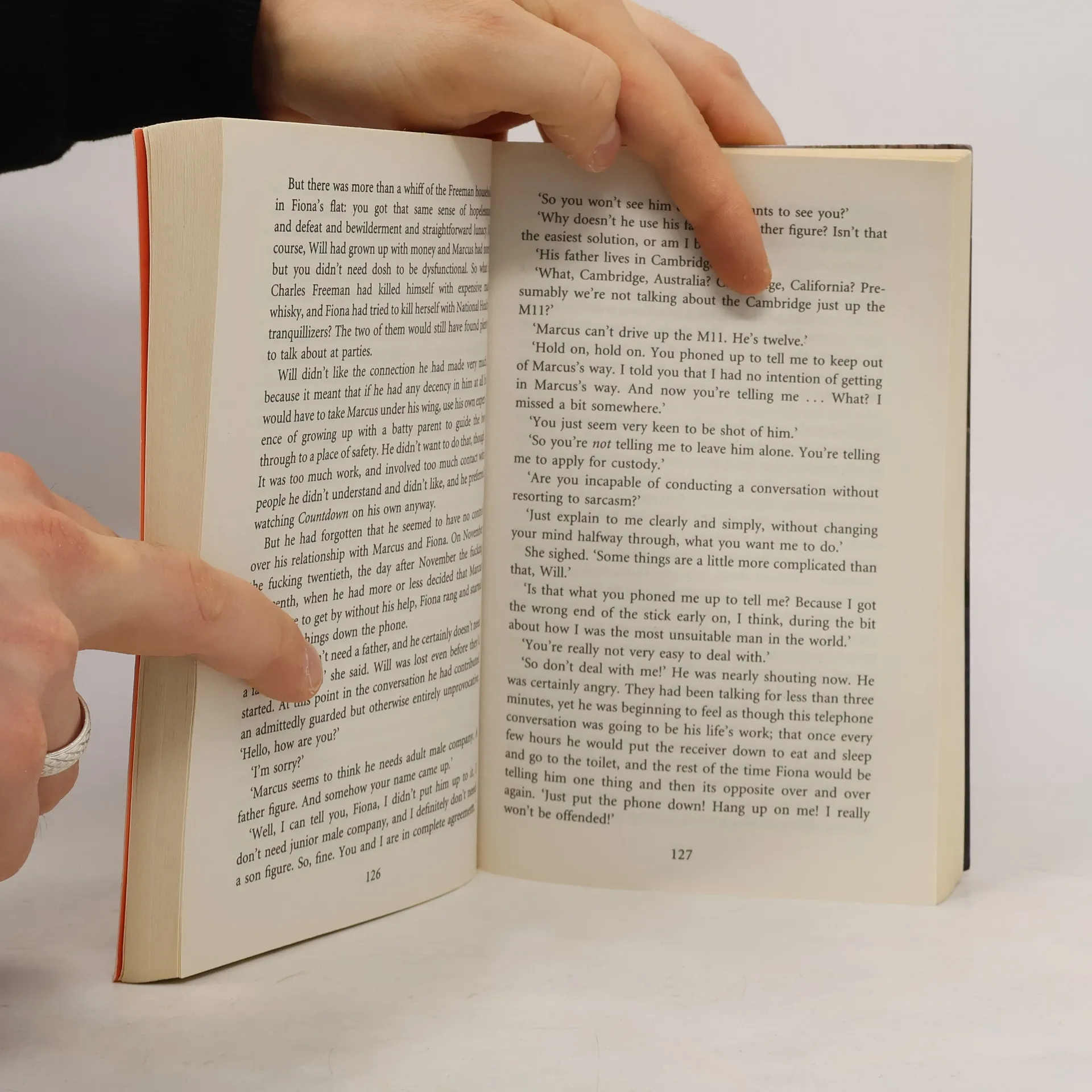 Will is thirty-six but acts like a teenager. Single, child-free and still feeling cool, he reads the right magazines, goes to the right clubs and knows which trainers to wear. He's also discovered a great way to score with women at single parents' groups, full of available (and grateful) mothers all waiting for Mr Nice Guy. That's where he meets Marcus, the oldest twelve-year-old in the world. Marcus is a bit strange: he listens to Joni Mitchell and Mozart, he looks after his Mum and he's never even owned a pair of trainers. Perhaps if Will can teach Marcus how to be a kid, Marcus can help Will grow up and they can both start to act their age.