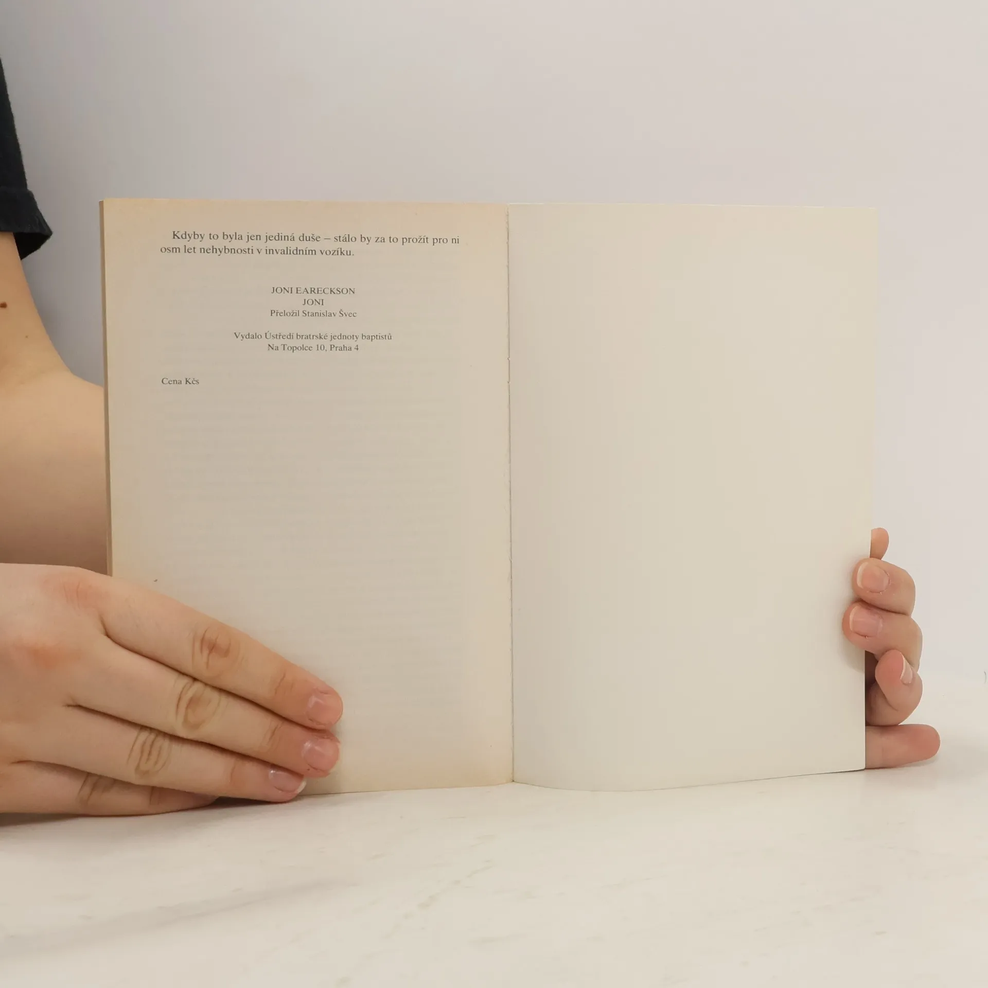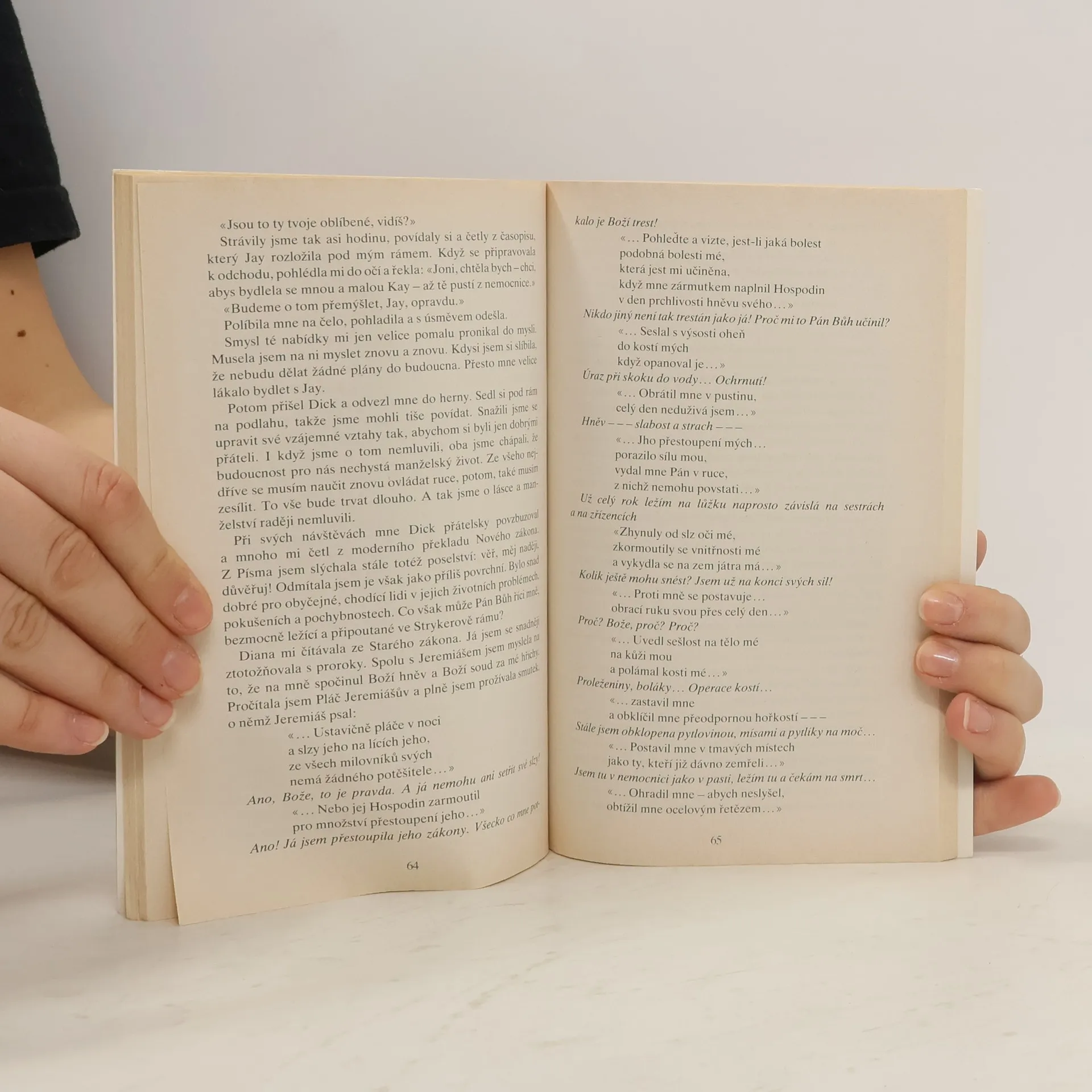 Příběh Joni Eareckson, která v dospívání hledá smysl a náplň svého života a stává se křesťankou. Přesto je se svým životem nespokojená a prosí Boha o změnu. V sedmnácti letech je po úrazu při skoku do vody hospitalizována v nemocnici a je jí diagnostikováno poranění míchy mezi čtvrtým a pátým obratlem s následkem ochrnutí všech končetin. Joni podstupuje boj sama se sebou, se svým tělem i vírou. Nechce se smířit s tím, že již nebude moci chodit. Hledá smysl svého zranění a věří v Boží pomoc. Úraz chápe jako zkoušku víry, po které jí Bůh zázračně uzdraví. Při hospitalizaci v nemocnicích i rehabilitačním centru prochází Joni střídavě depresemi a nadějemi. Postupně se začne vyrovnávat s trvalostí svého postižení, učí se nezávislosti na cizí pomoci a také kreslit pomocí úst. Díky rodině, přátelům a nezdolné víře v Boží prozřetelnost dokáže se nakonec vyrovnat se svým údělem a pochopit jeho smysl. Prostřednictvím kreseb se stane známou osobností a šíří své zkušenosti a svědectví pomocí televize, článků a různých přednášek k ostatním lidem. Kniha je rozdělena do šestnácti kapitol, obsahuje úvod a závěr. Autorka popisuje události, myšlenky i pocity, které ji provázeli od počátku nehody až k vyrovnání se s postižením a nalezením jeho smyslu. V knize je znázorněna důležitost pomoci rodiny, podpory přátel, víry a možnosti seberealizace.
