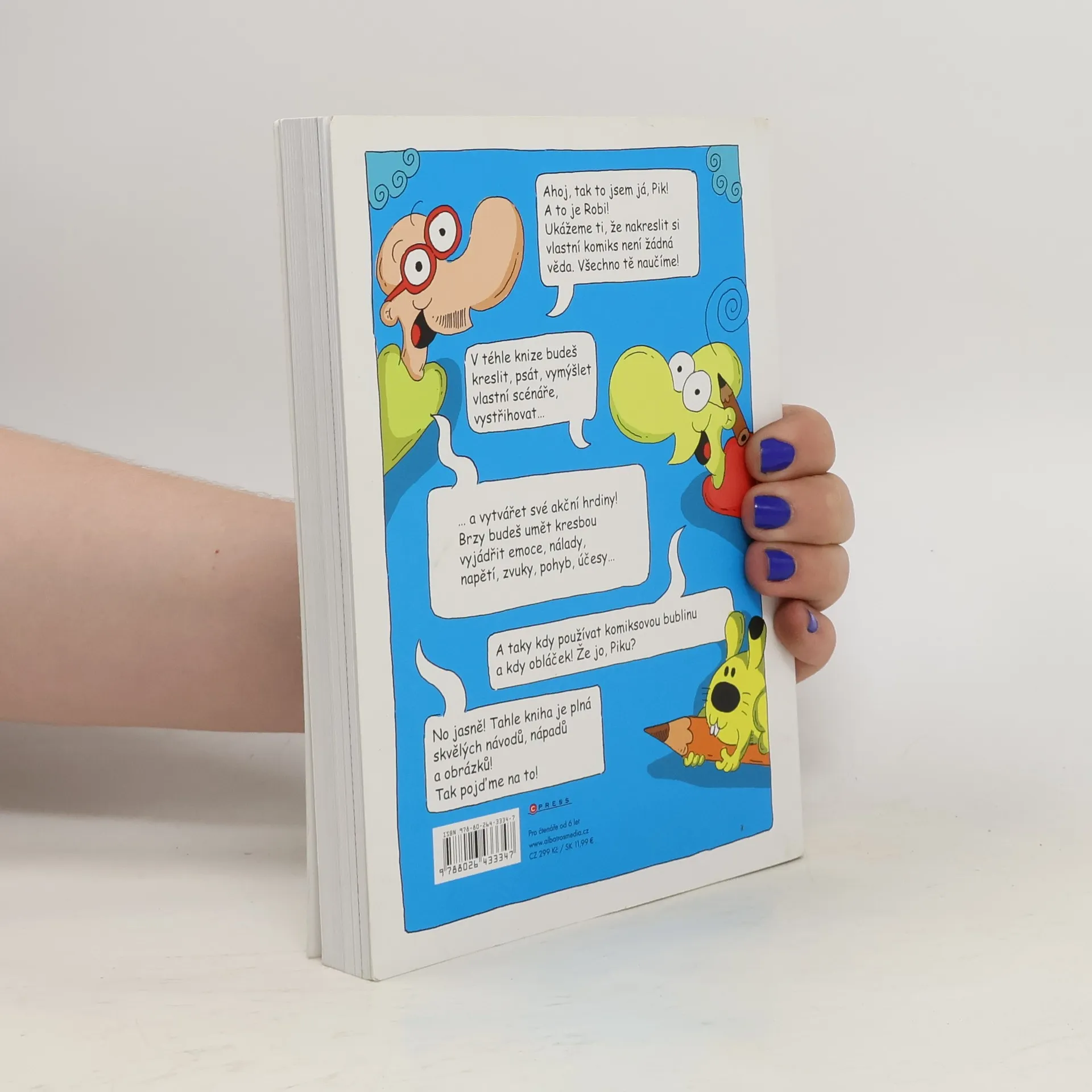Mají vaše děti rády komiksy a rády kreslí? Pak je pro ně tato kniha plná zábavy i ponaučení jako stvořená! Děti se podle ní naučí hravou formou základy tvorby komiksu, jeho zákonitosti, používané prvky a jevy. Mohou do ní kreslit, psát, vytvářet vlastní scénáře, vystřihovat, čmárat a dělat cokoli, co jim umožní nakreslit si svůj vlastní a jedinečný příběh. Na 240 stranách autoři vysvětlí základní postupy, naučí děti vytvořit své akční hrdiny, kresbou vyjadřovat emoce, nálady, napětí, zvuky, pohyb, účesy.